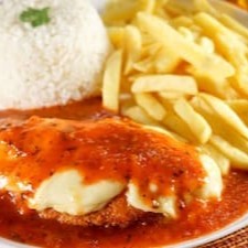 Acompanha arroz, feijão e batata frita Parmegiana de Frango com Molho Artesanal Itens todos separados. Filé de frango macio, empanado no ponto certo, coberto com nosso molho de tomate artesanal, preparado lentamente com temperos frescos e muito sabor. Finalizado com queijo derretido. Uma combinação irresistível de crocância, suculência e cremosidade, perfeita para matar a fome com muito sabor caseiro.