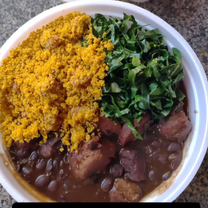 Deliciosa feijoada caseira, não vai pé, orelha etc.. apenas as carnes magras. Acompanha arroz, farofa,couve, vinagrete e torresmo