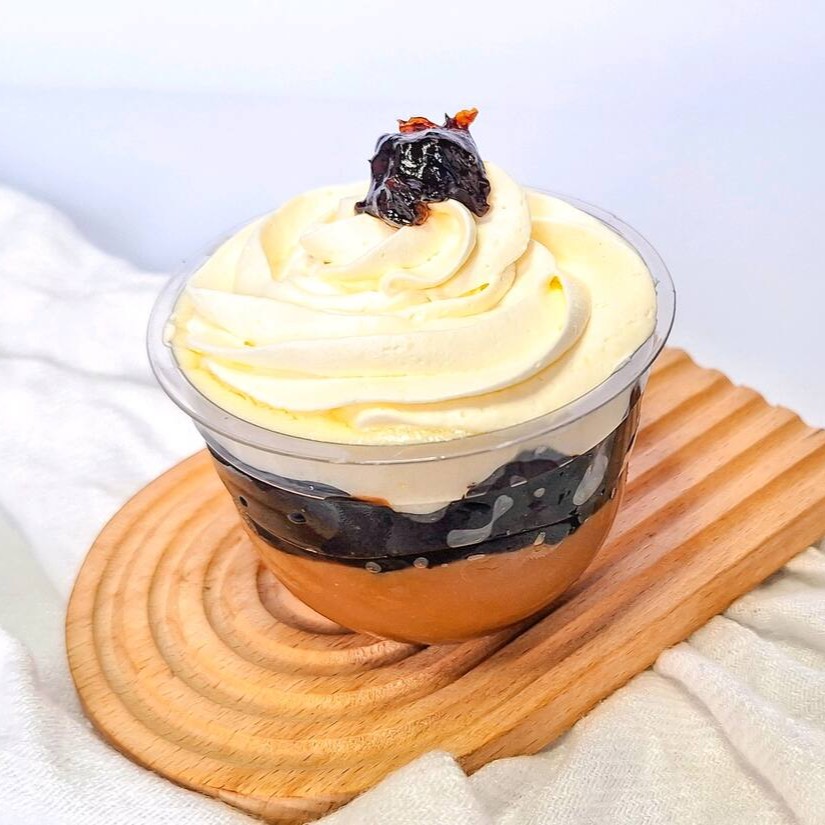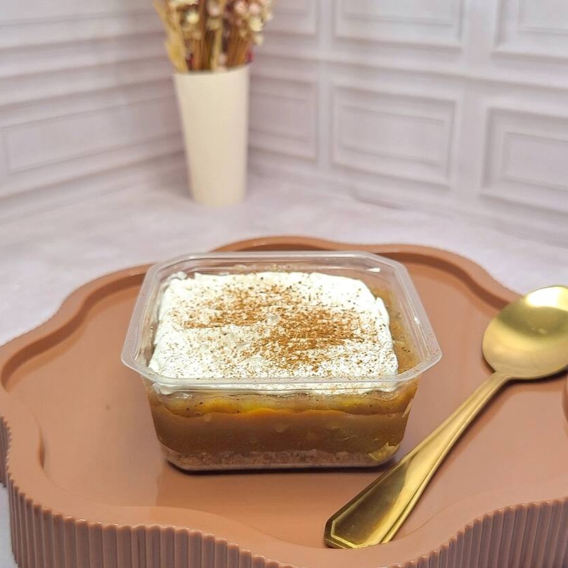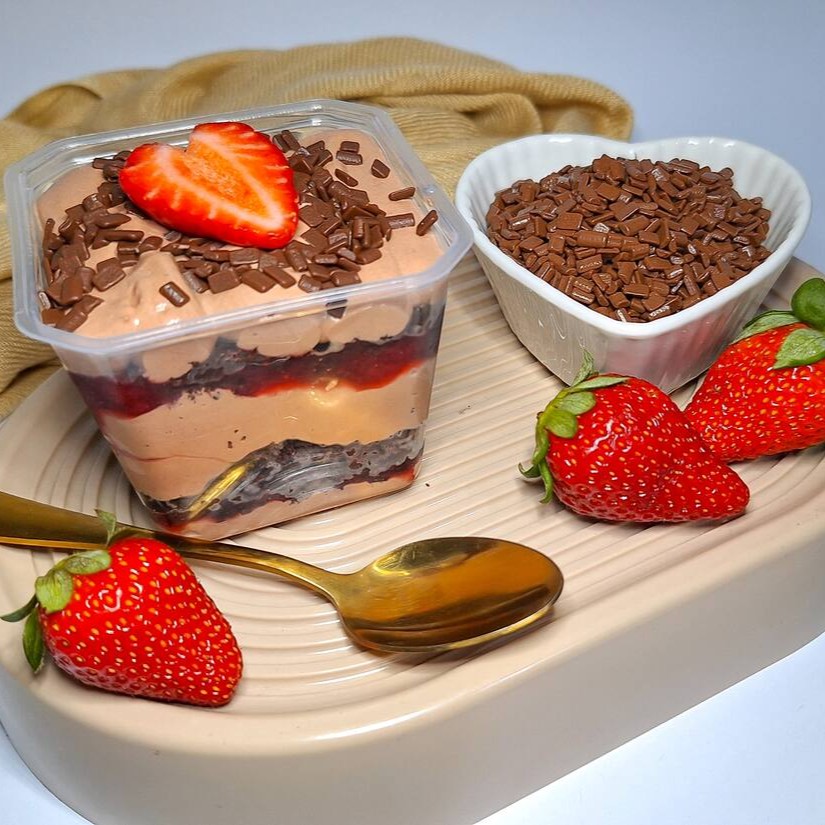 Deliciosa sobremesa, com uma base crocante de farofa de biscoito, uma camada de brigadeiro cremoso de doce de leite, doce de banana caramelizada finalizado com chantininho e canela. 150ml