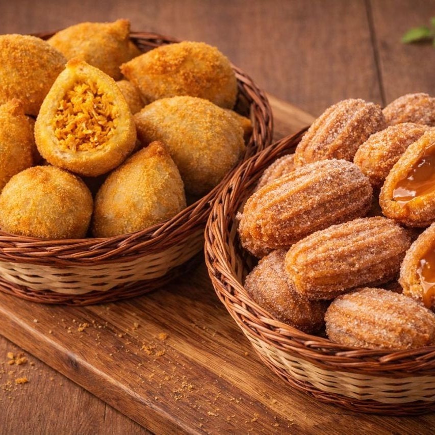 Combo variado para compartilhar. 50 salgados fritos na hora + 20 mini churros para agradar todo mundo.