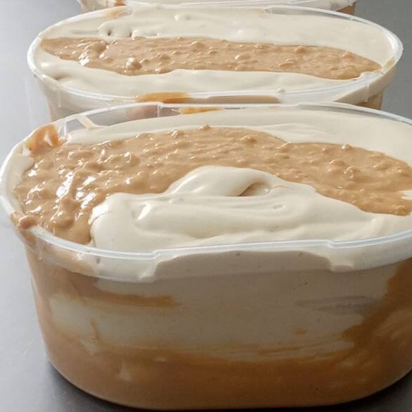 Sorvete Sabor Leitinho com Recheio de Leitinho e Crocante de Amendoim. Tamanho 1 litro. Sorvete Artesanal