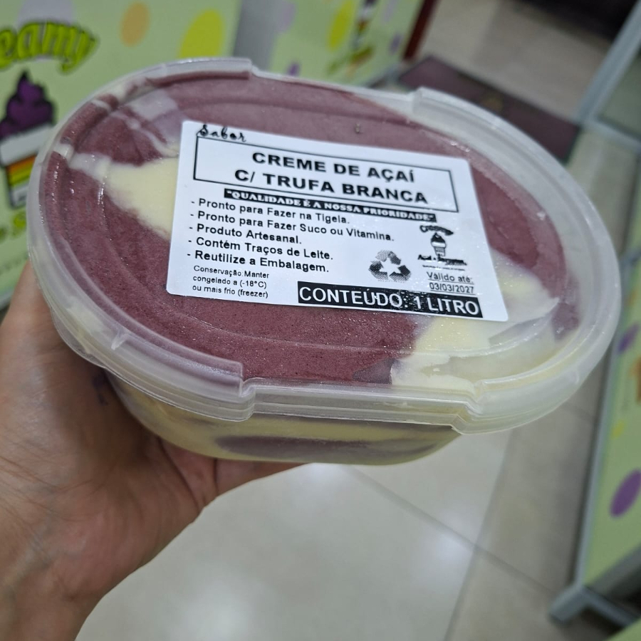 Pote de Açaí com Recheio de Trufa Branca. Açaí muito Cremoso. Tamanho 1 litro. Produto Artesanal Fabricação Própria.