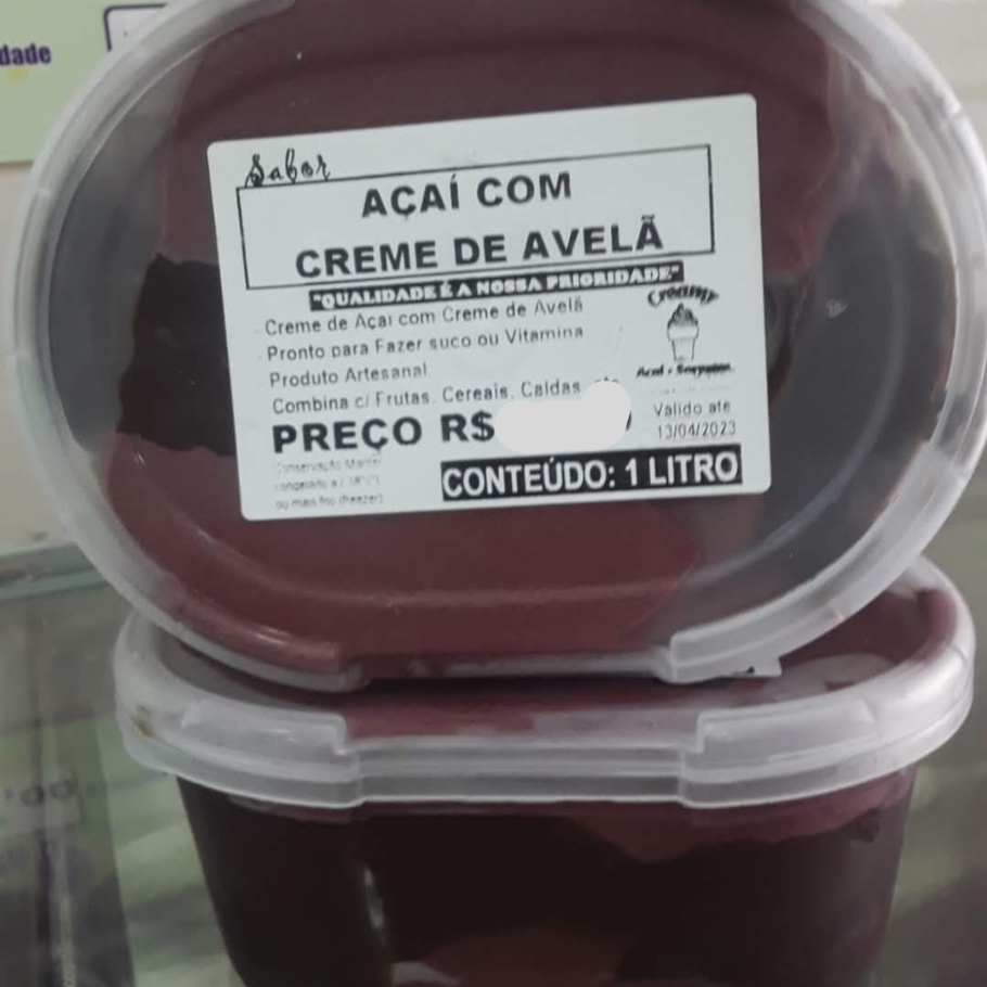Pote de Açaí com Recheio de Avelã. Açaí muito Cremoso. Tamanho 1 litro. Produto Artesanal Fabricação Própria.