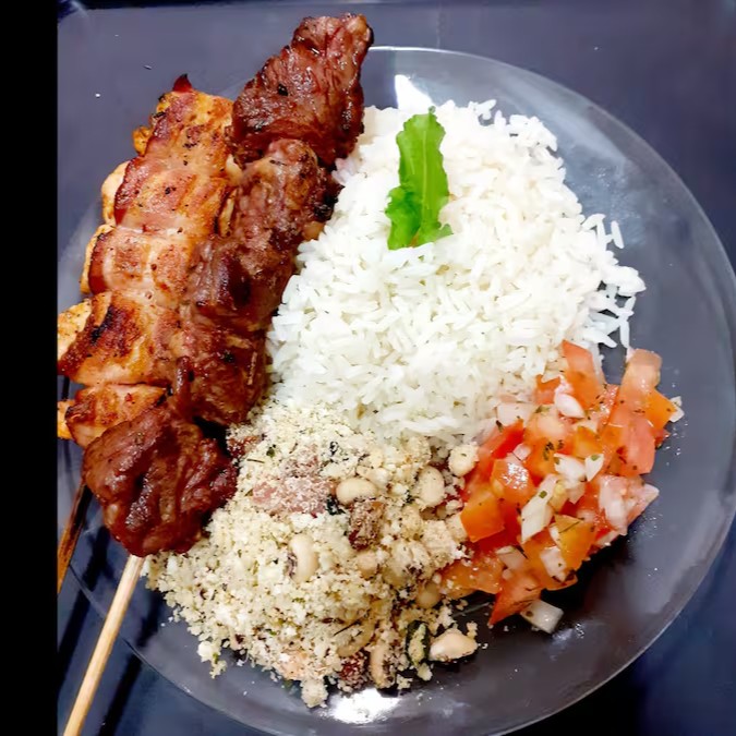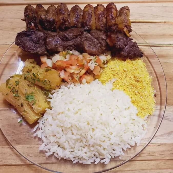 A 'Jantinha da Terra' é um prato repleto de sabores autênticos e caseiros. Ela é composta por dois suculentos espetinhos, preparados com carnes selecionadas, que harmonizam perfeitamente com um arroz fresquinho e leve. No prato, ainda encontramos um vinagrete vibrante e picante, que adiciona um toque especial a cada garfada. A mandioca cozida, macia e aveludada, e a farofa crocante e saborosa, complementam esta refeição, tornando-a mais do que completa. Uma verdadeira celebração dos sabores da terra em uma única refeição.