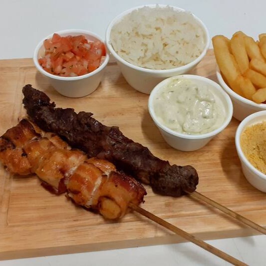 Escolha 10 espetinhos de sua preferência e os acompanhamentos (farofa e molhos).