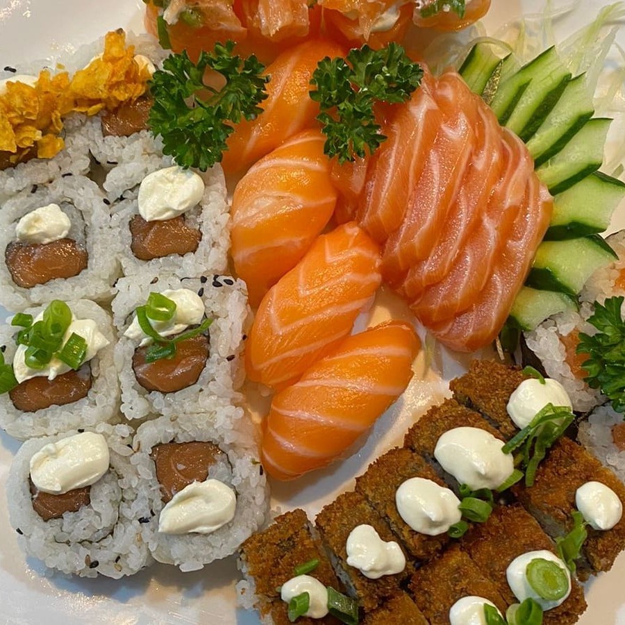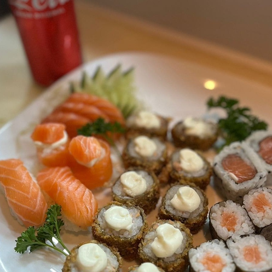 8 Sashimis, 10 uramakis, 4 niguiris, 6 hossomakis de salmão, 6 hossomakis de pepino, 3 Luizinhos de salmão, 3 Luizinhos de pepino com salmão