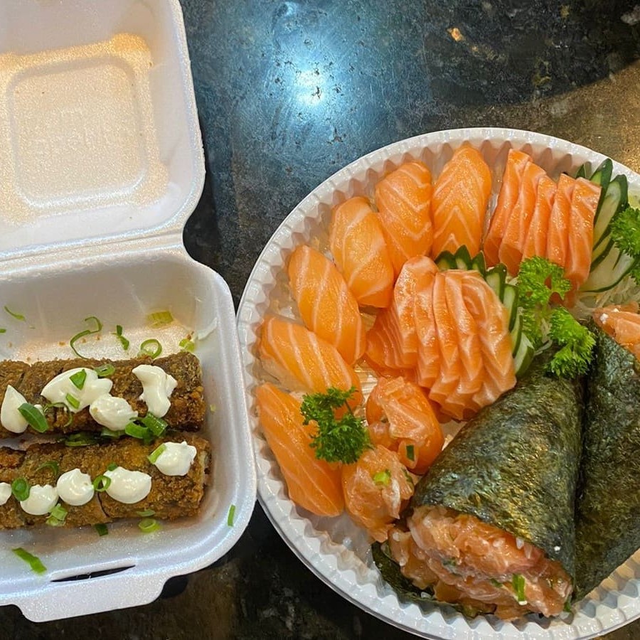 2 temakis tradicionais ( arroz, salmão, cream cheese e cebolinha) 10 unidades de sashimis, 6 niguiris, 2 Luizinhos de salmão e 10 unidades de hot roll