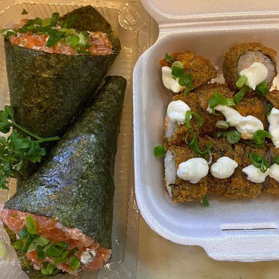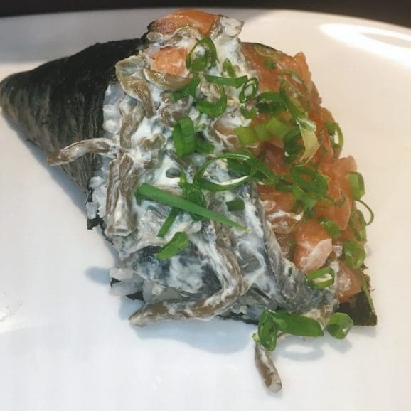 2 Temakis de arroz, salmão cru, cream cheese e cebolinha