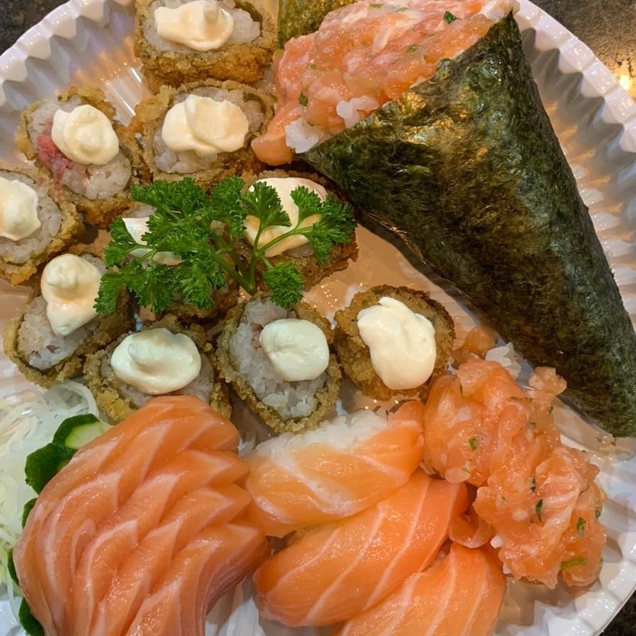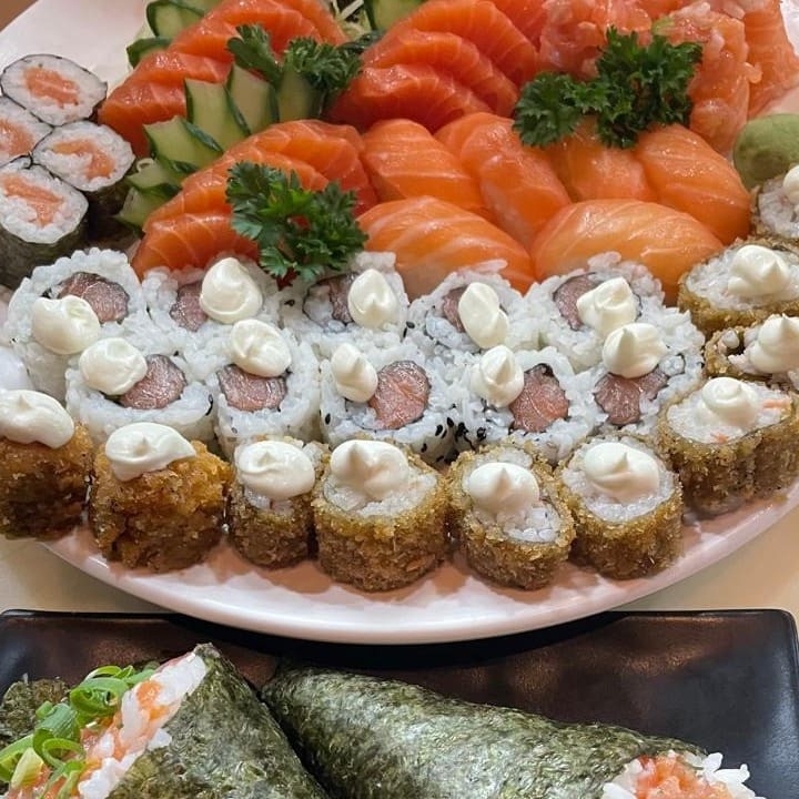 4 temakis tradicionais ( arroz, salmão, cream cheese e cebolinha) 20 sashimis, 20 unidades de hot roll, 12 niguiris, 4 Luizinhos de salmão