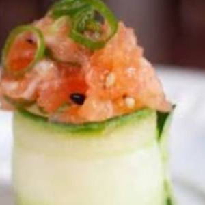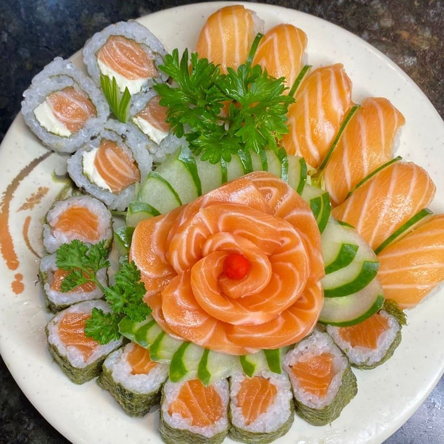 5 sashimi de salmão, 1 temaki de salmão com cream cheese e cebolinha , 4 uramaki de salmão, 2 hossomaki de salmão, 5 unidade de hot hool e 2 niguiri de salmão.