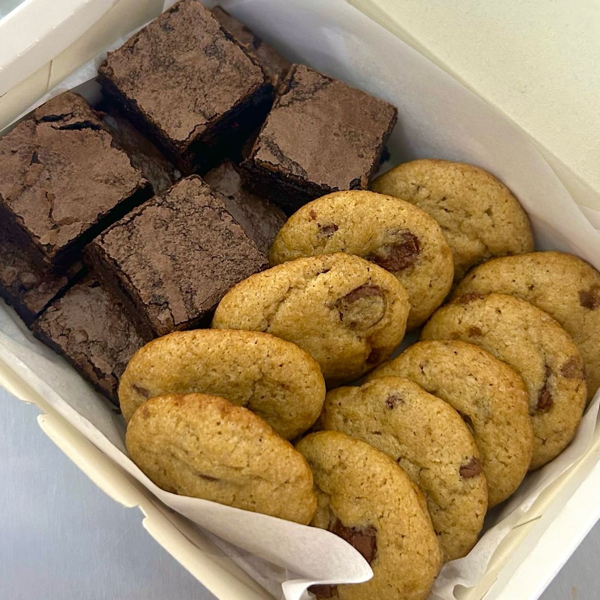 10 unidades do nosso delicioso mini brownie tradicional (3,5x3,5), feito com chocolate 70% + 10 unidades dos nossos mini cookies tradicionais, feitos com massa de baunilha e gotas de chocolate nobre blend. Acompanha mousse de Ninho artesanal, Nutella, creme Bueno (Kinder), doce de leite ou creme de pistache, você escolhe! (Serve de 3 à 4 pessoas)
