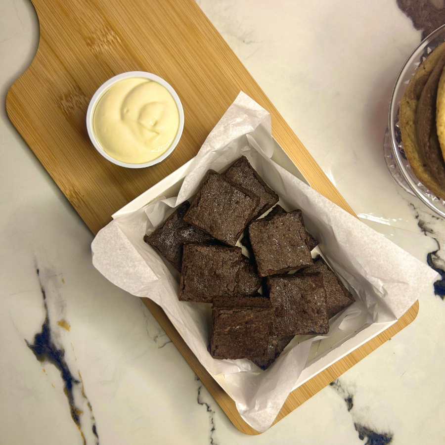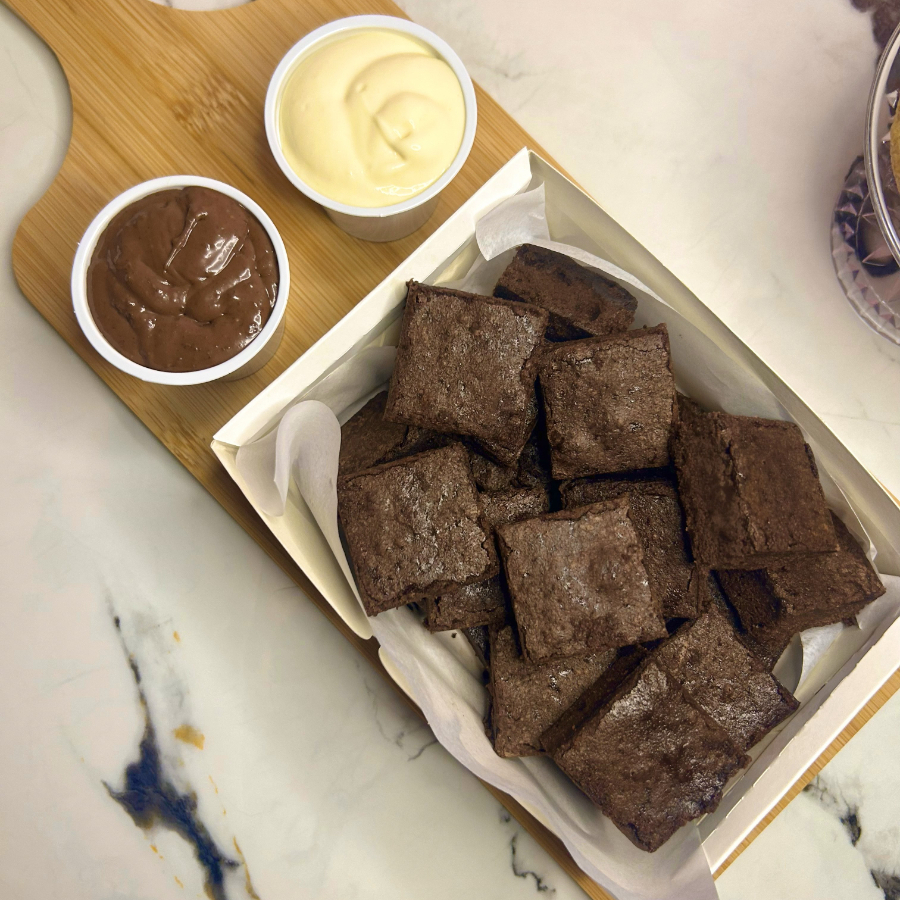 10 mini brownies tradicionais feitos com chocolate 70%! De textura densa e sabor equilibrado. Acompanha mousse de Ninho artesanal, Nutella, creme Bueno (Kinder), doce de leite, creme de pistache ou creme de Ovomaltine, você escolhe! (Serve de 1 à 2 pessoas)