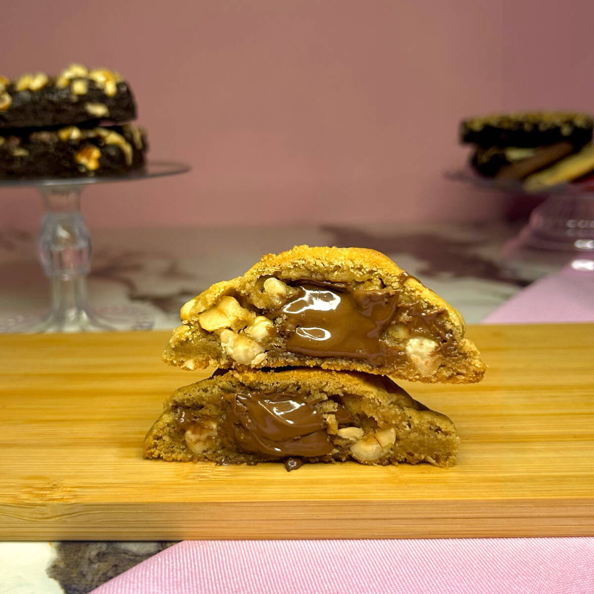 Massa de baunilha com gotas de chocolate nobre blend, avelãs tostadas e recheio generoso de Nutella (Original). Cookie macio por dentro e crocante por fora. Assado na hora!
