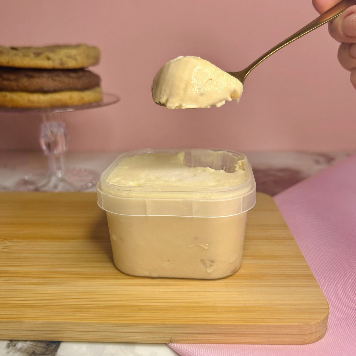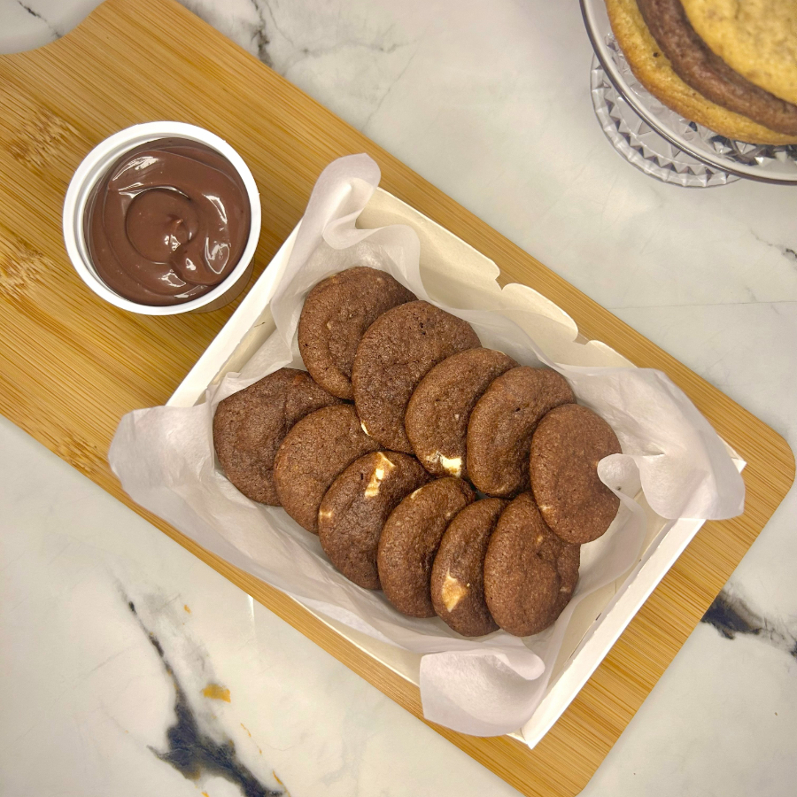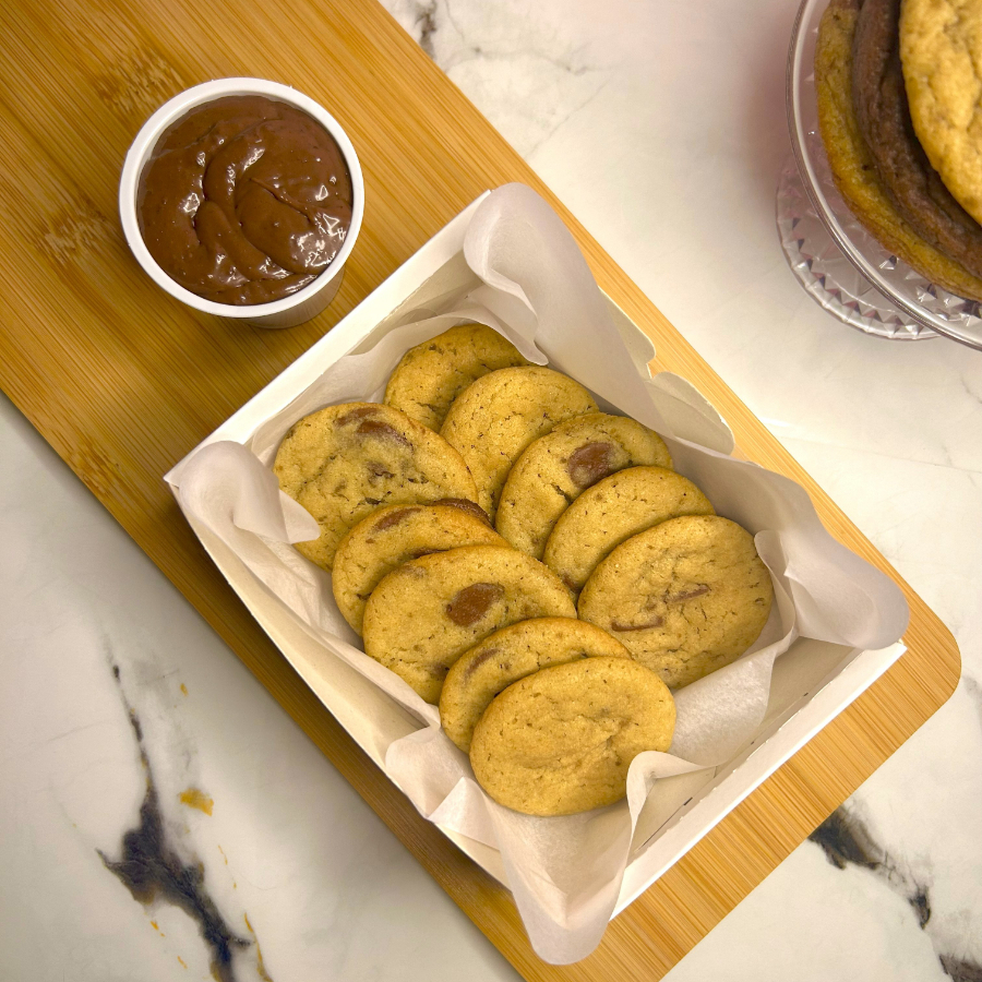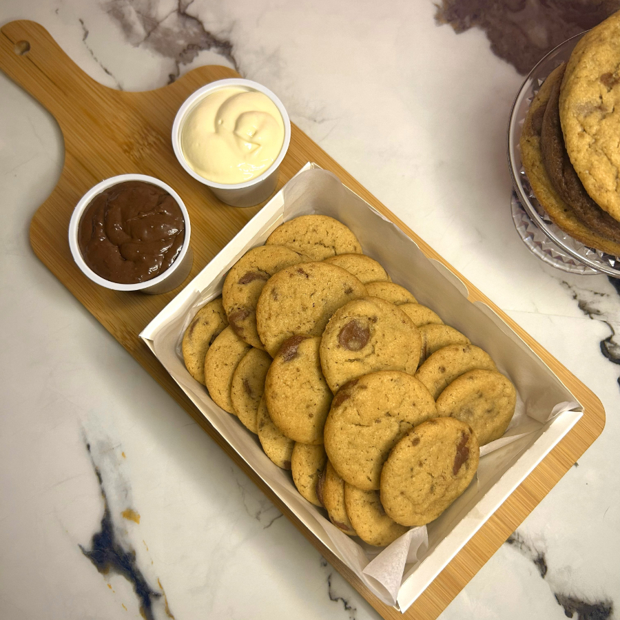 10 mini cookies assados na hora! Crocantes por fora e macios por dentro, feitos com massa de baunilha e gotas de chocolate nobre blend. Acompanha mousse de Ninho artesanal, Nutella, creme Bueno (Kinder), doce de leite ou creme de pistache, você escolhe! (Serve de 1 à 2 pessoas)