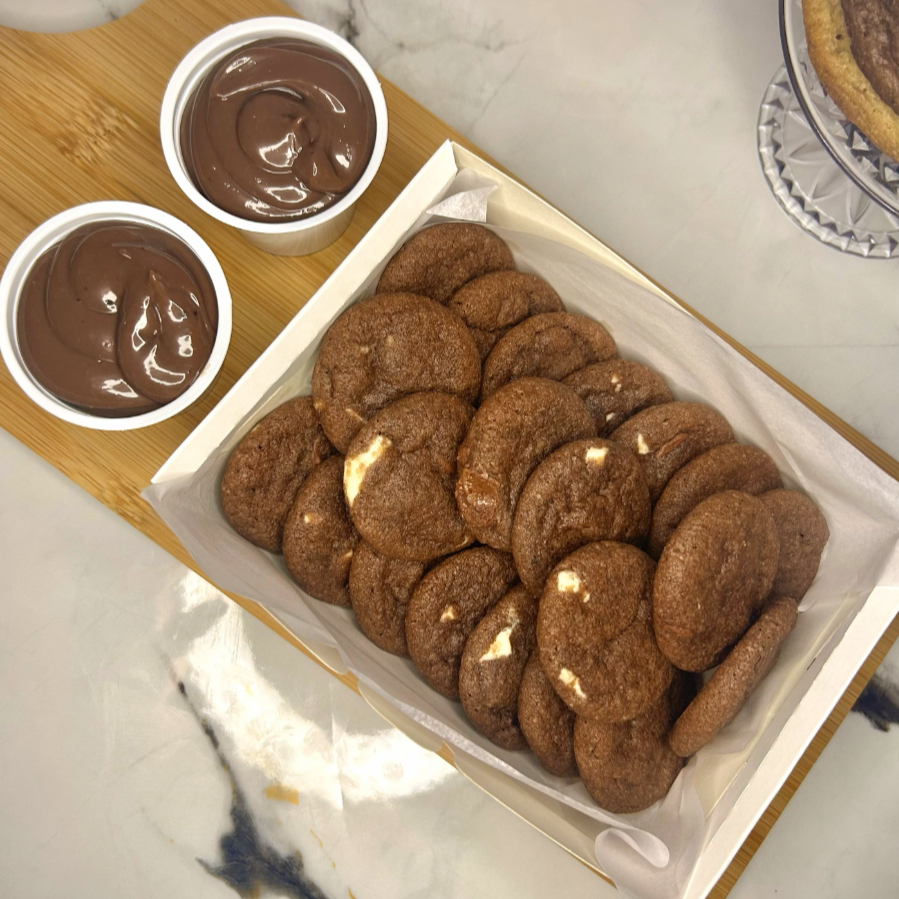 20 mini cookies de chocolate 50% com gotas de chocolate nobre branco e blend. Acompanha brigadeiro artesanal (120 ml). (Serve de 3 à 4 pessoas)