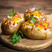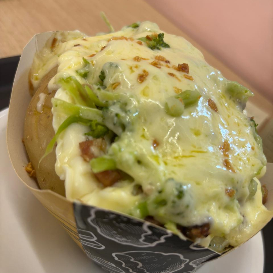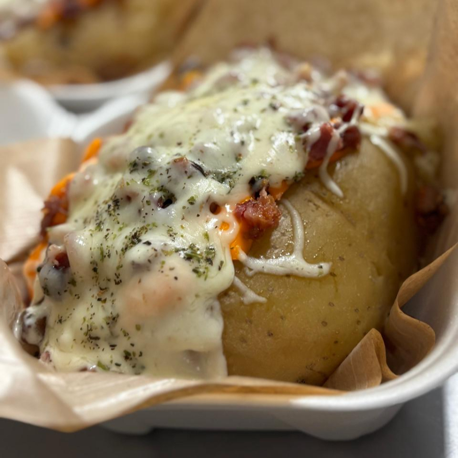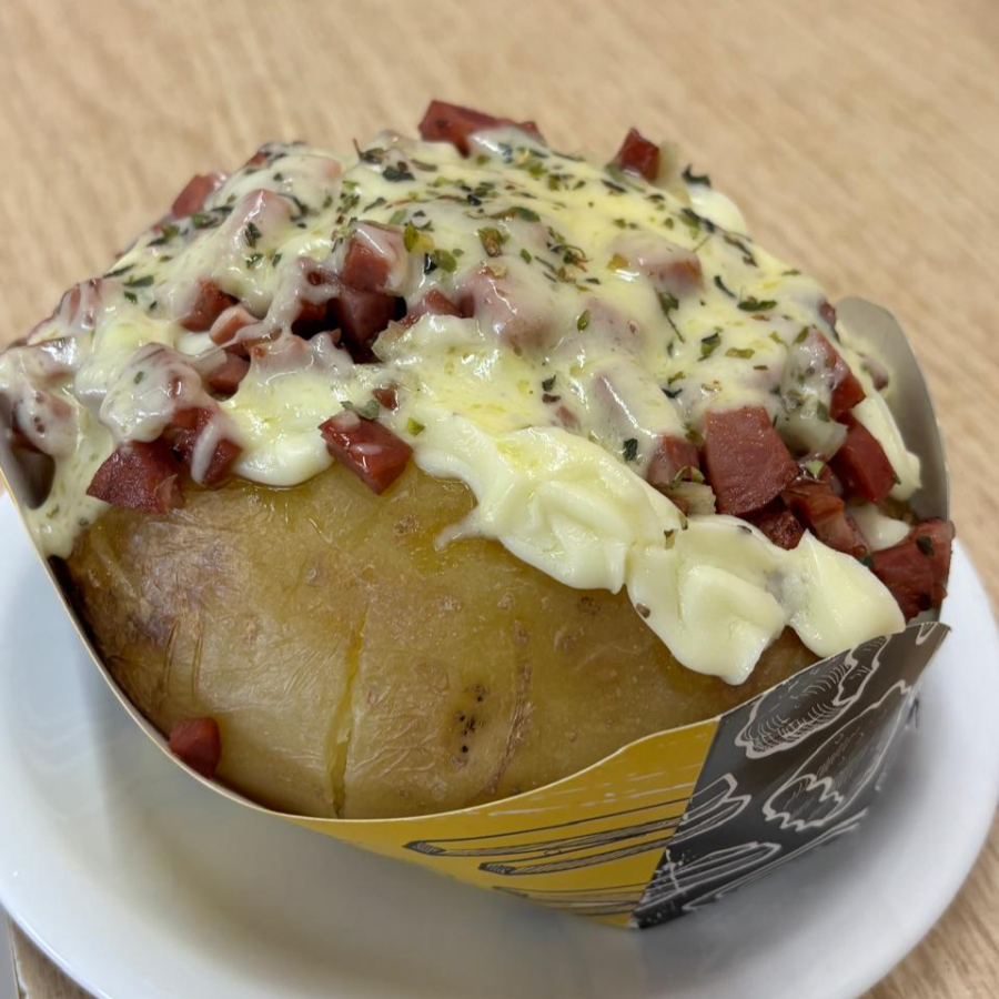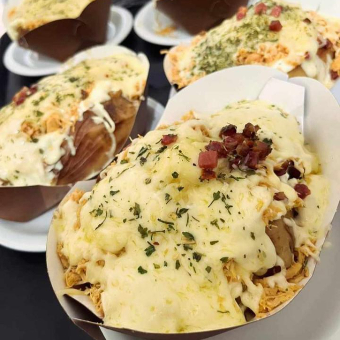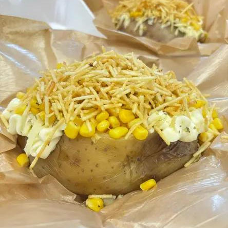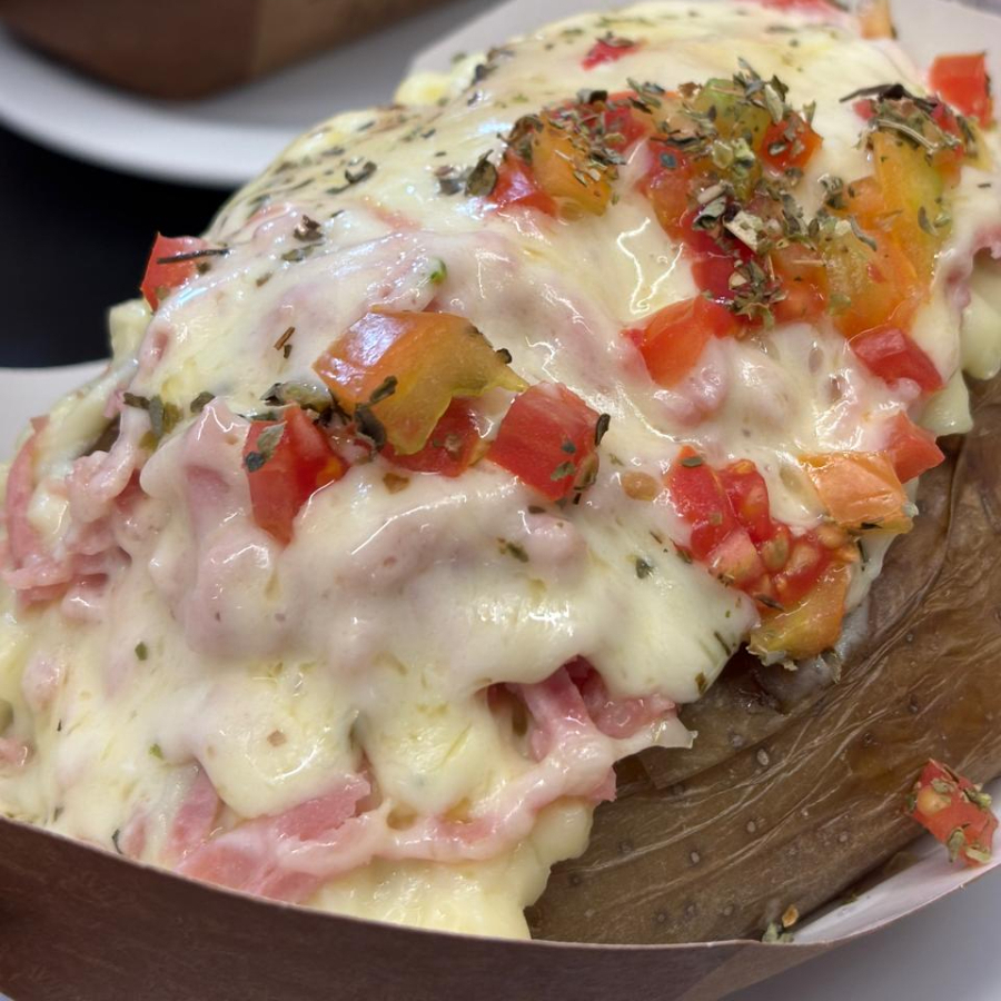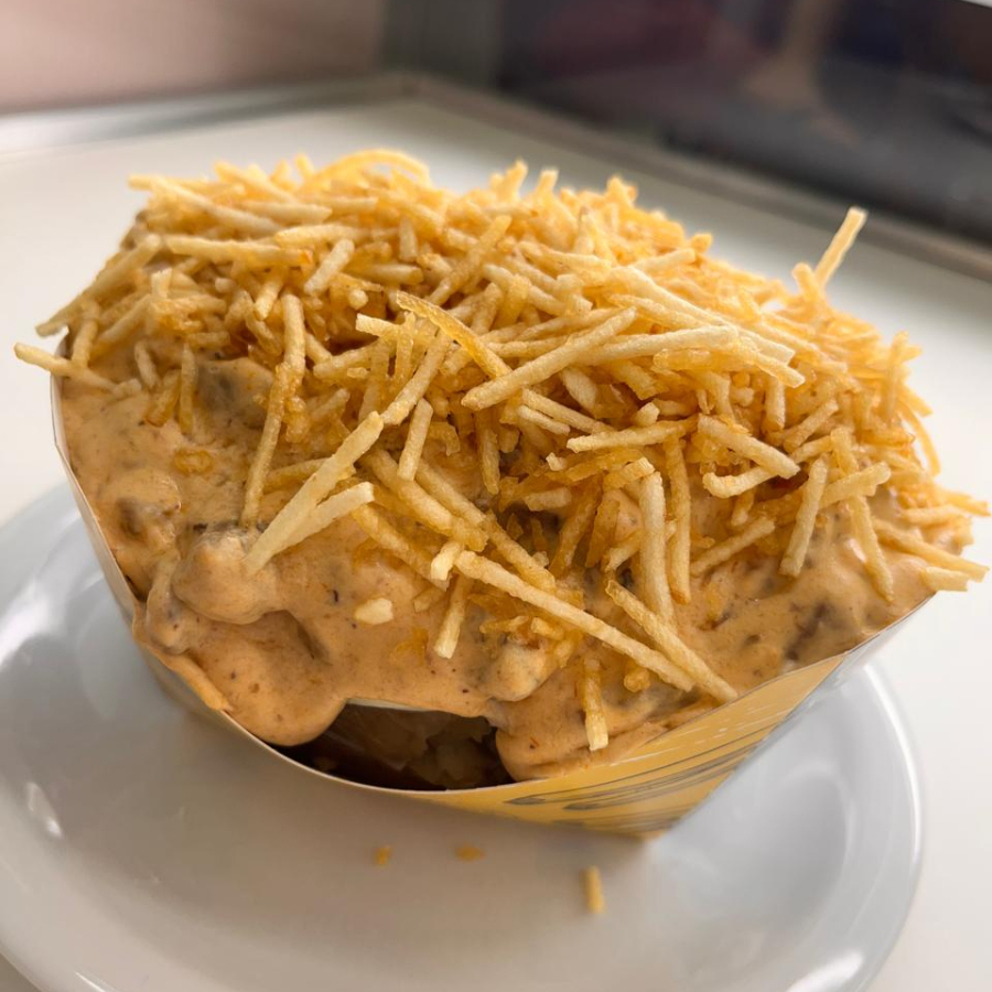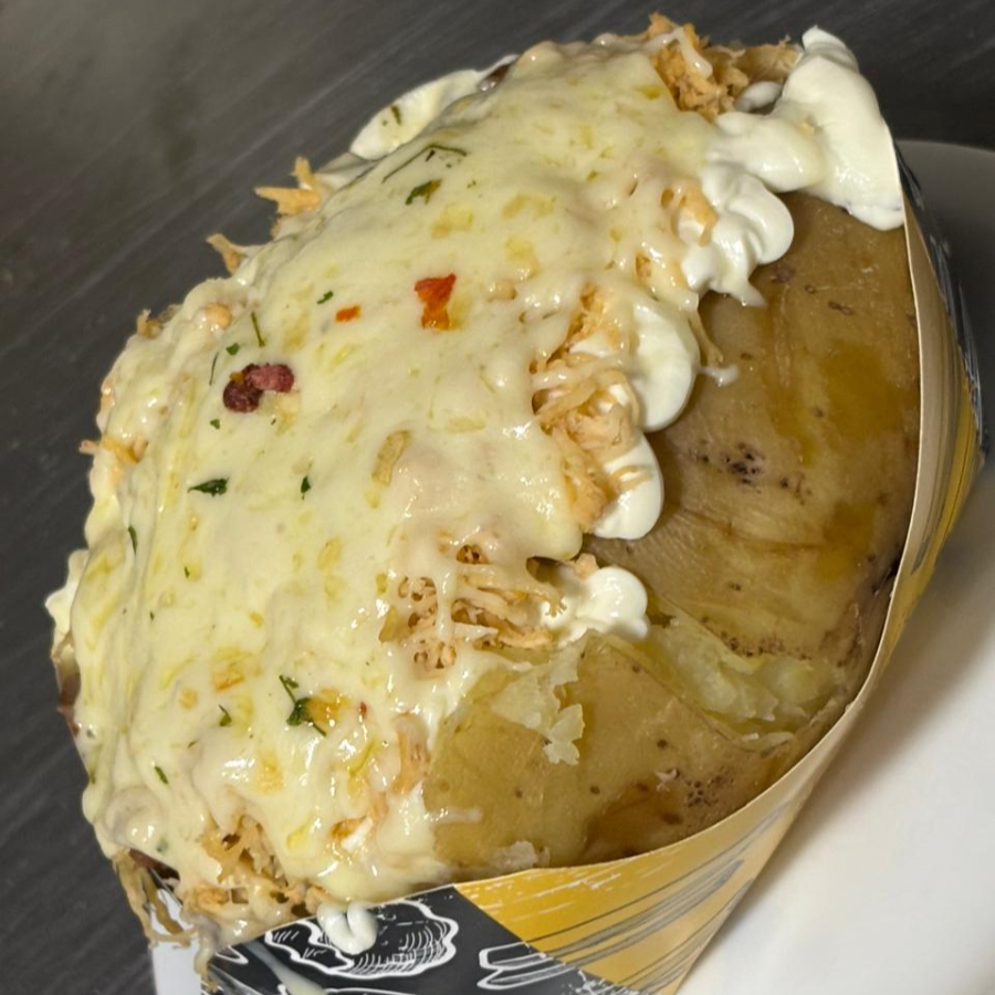 Batata assada temperada com manteiga e sal, uma generosa camada requeijao e nossO delicioso strogonoff de carne cremoso, finalizada com batata palha