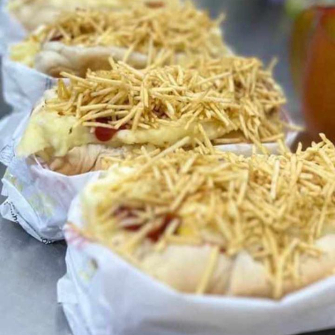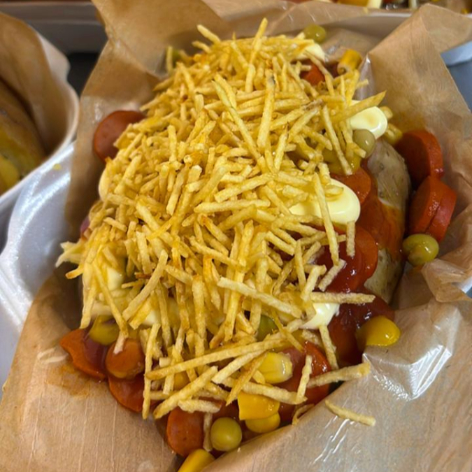 Servido no pão macio com salsicha suculento, milho, ervilha, mostarda, maionese, ketchup, puré de batata cremoso e uma camada crocante de batata palha