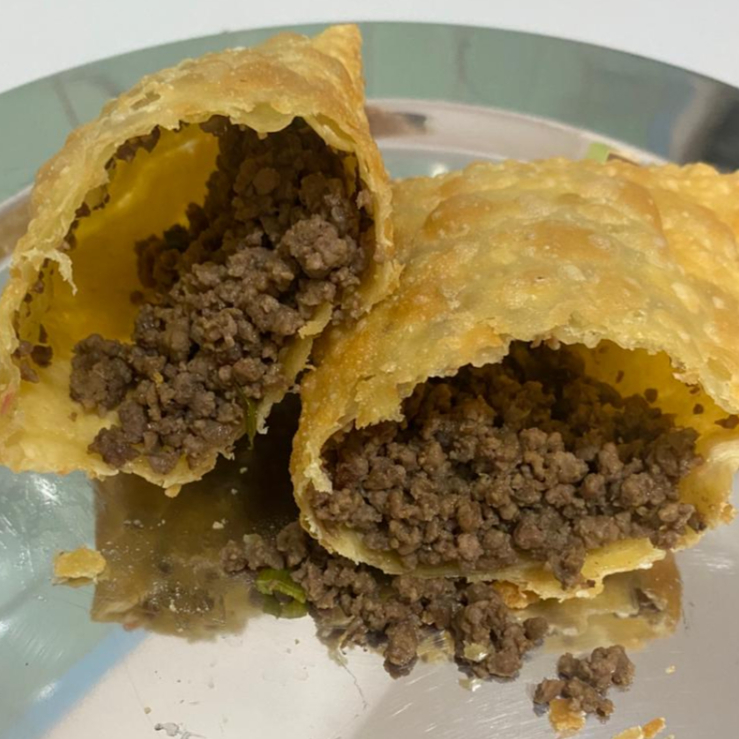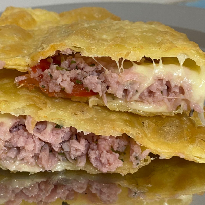 Recheado com 80 g de carne moída temperada e massa crocante.