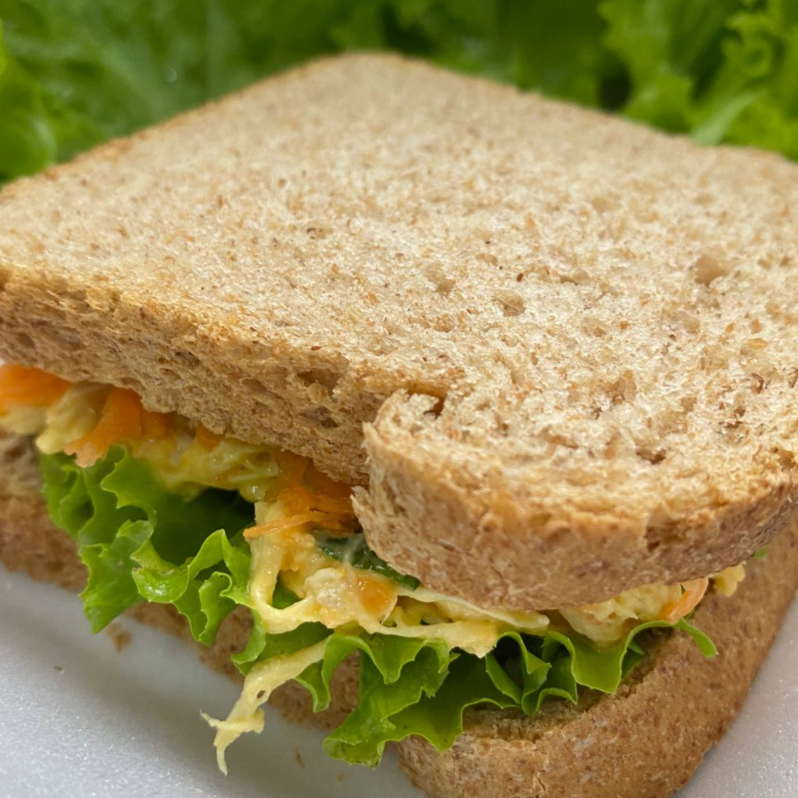 Pão 37% integral, generosa camada de patê de frango, maionese, cenoura ralada (no patê e extra para crocância), alface fresquinha e cheiro verde.