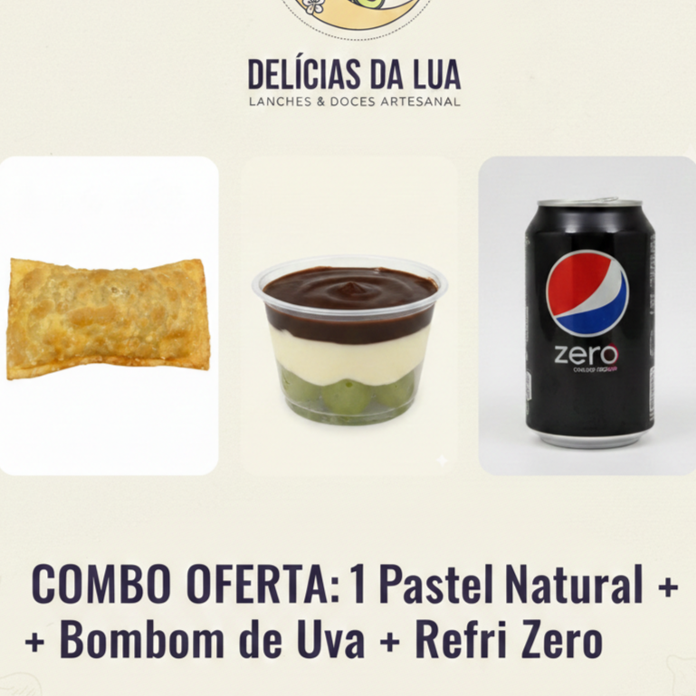 Pastel Salgado (Carne, Carne e Queijo, Queijo ou Pizza) + Surpresa de Uva: Uvas verdes, creme branco e ganache de chocolate para fechar + refrigerante zero (Pepsi/Guaraná Antártica)