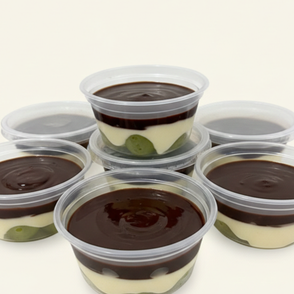 Uvas verdes, creme branco e ganache de chocolate para fechar