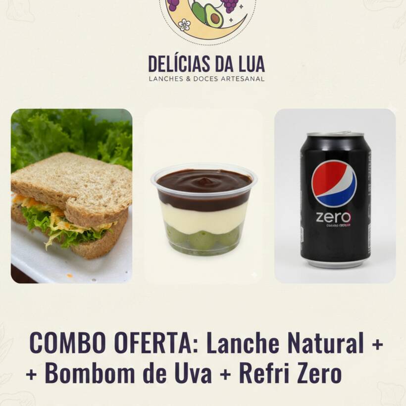Lanche Natural: Pão 37% integral, generosa camada de patê de frango, maionese, cenoura ralada (no patê e extra para crocância), alface fresquinha e cheiro verde. + Bombom de uva: Uvas verdes, creme branco e ganache de chocolate para fechar + Refrigerante Zero Pepsi/Guaraná Antartica