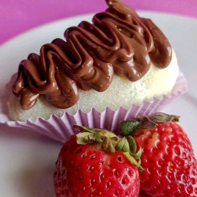 Coxinha de morango com Ninho passada no granulado de chocolate branco e Nutella em cima serve uma pessoa