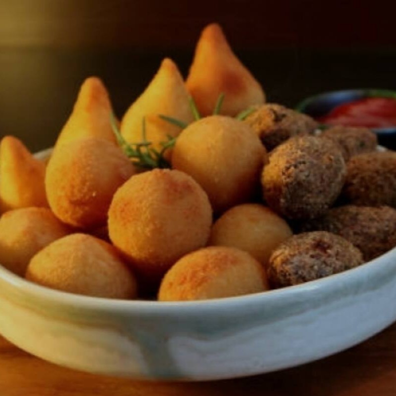 50 mini salgados fritos com sabores variados: coxinha, risole, presunto & queijo e bolinha de queijo.