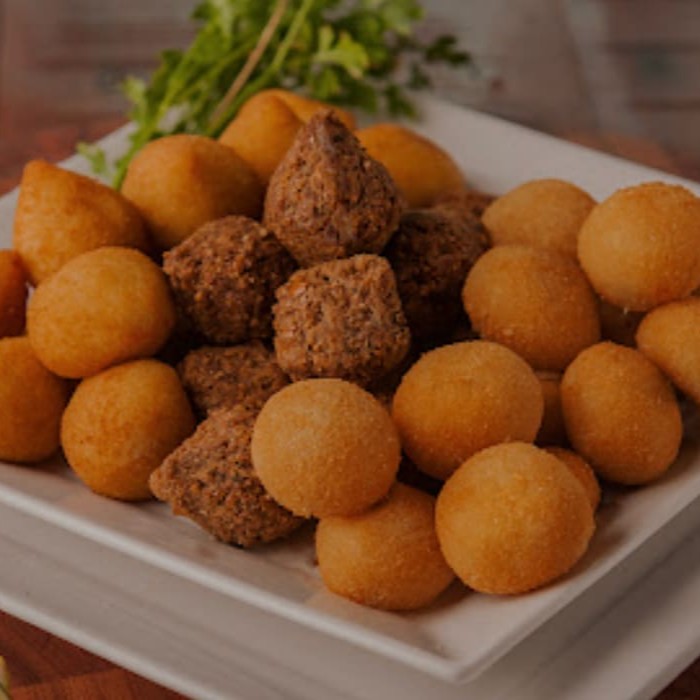 25 salgados de 20 gramas cada, incluindo coxinha, presunto & queijo, bolinha de queijo e croquete, risole de carne, salsicha empanada.
