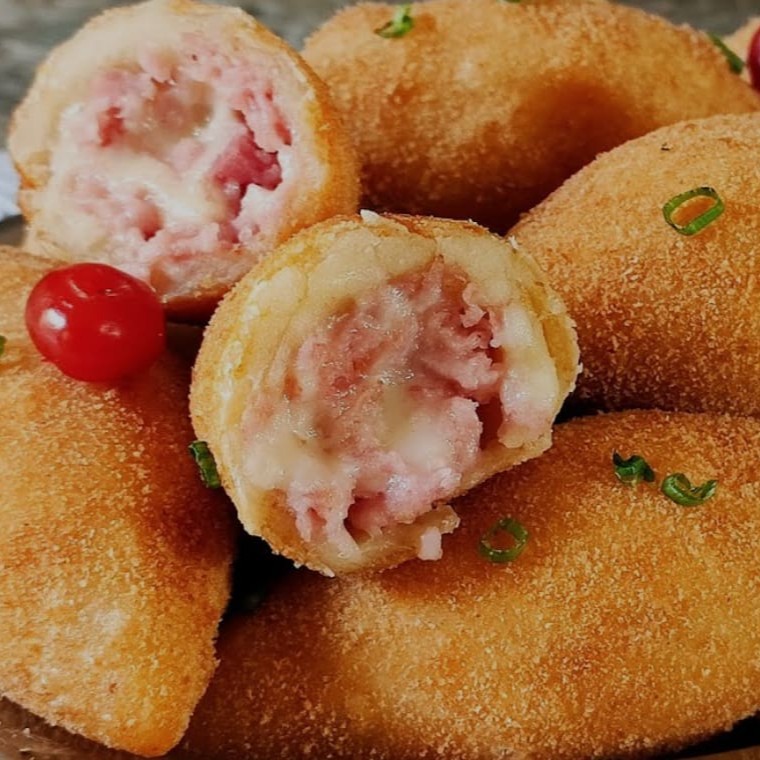 25 salgados tamanho festa, recheados com presunto e queijo. Aproximadamente 20g cada unidade.