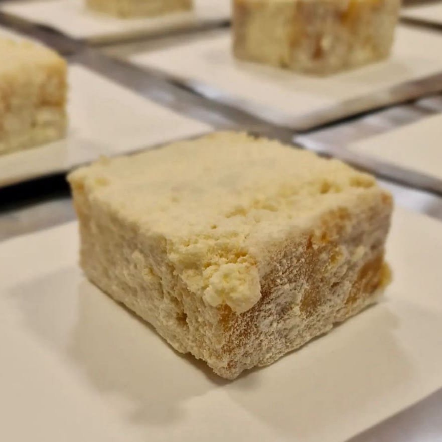 Clássico que pede Bis! Bolo branco molhadinho, com creme geladinho e muito doce de abacaxi preparado por nós! Embrulhado no papel alumínio igual de casa de vó.