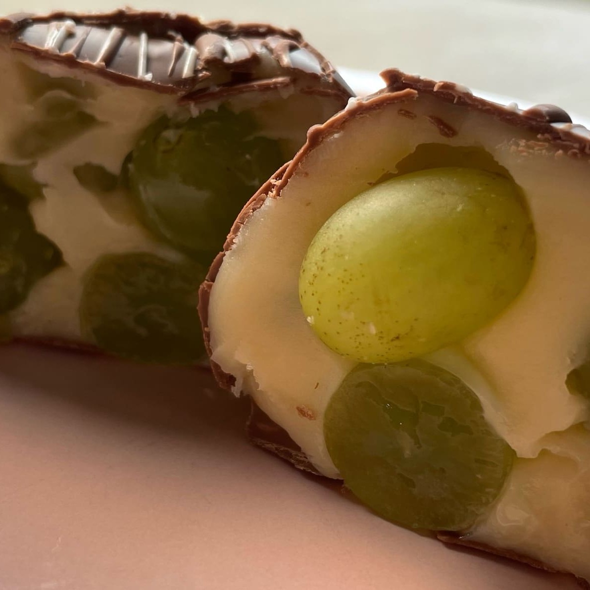 Uma camada do nosso fantástico brigadeiro branco, uvas verdes frescas envoltos numa fina camada de chocolate ao leite.