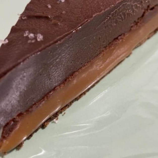 Deliciosa torta de chocolate com caramelo salgado e finalizada com leve toque de flor de sal.