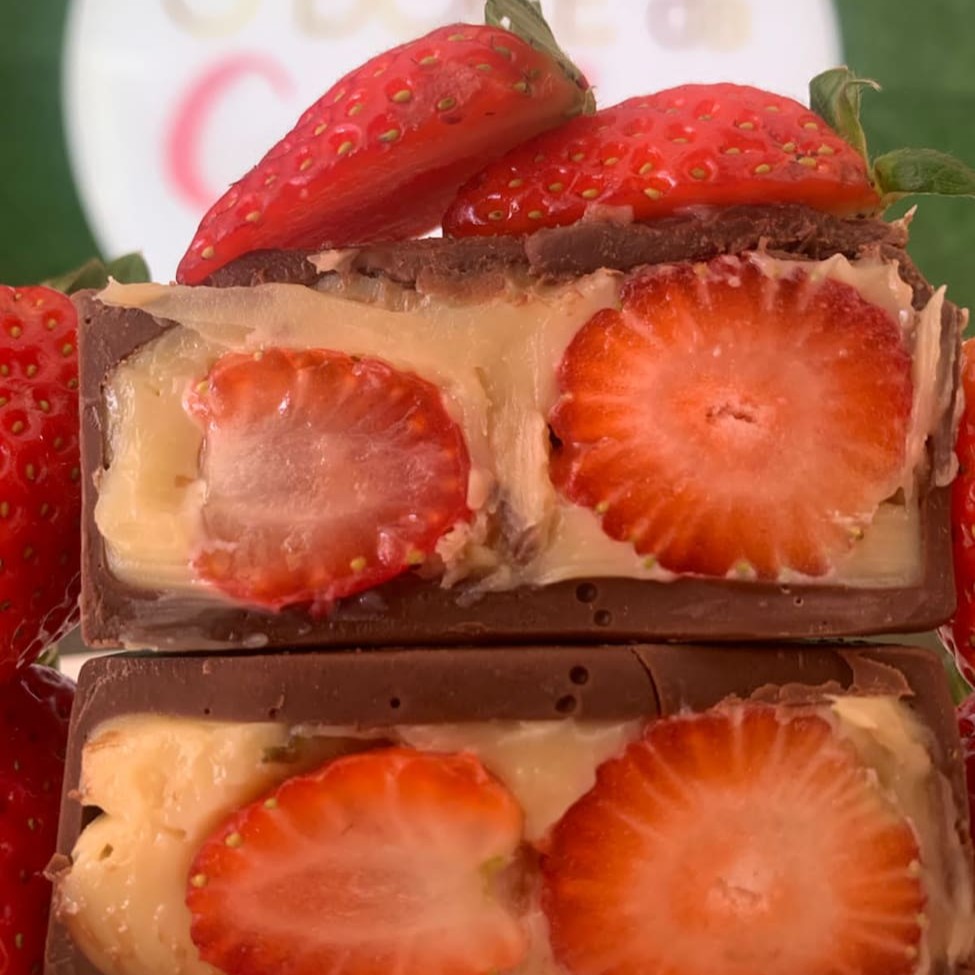 Massa caseira de chocolate , morangos frescos , brigadeiro choc Branco cremoso e brigadeiro chocolate ao leite cremoso
