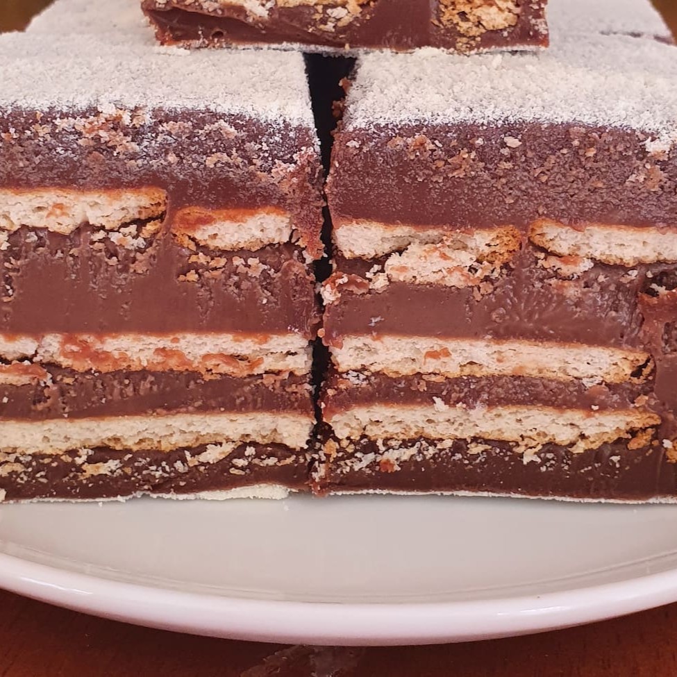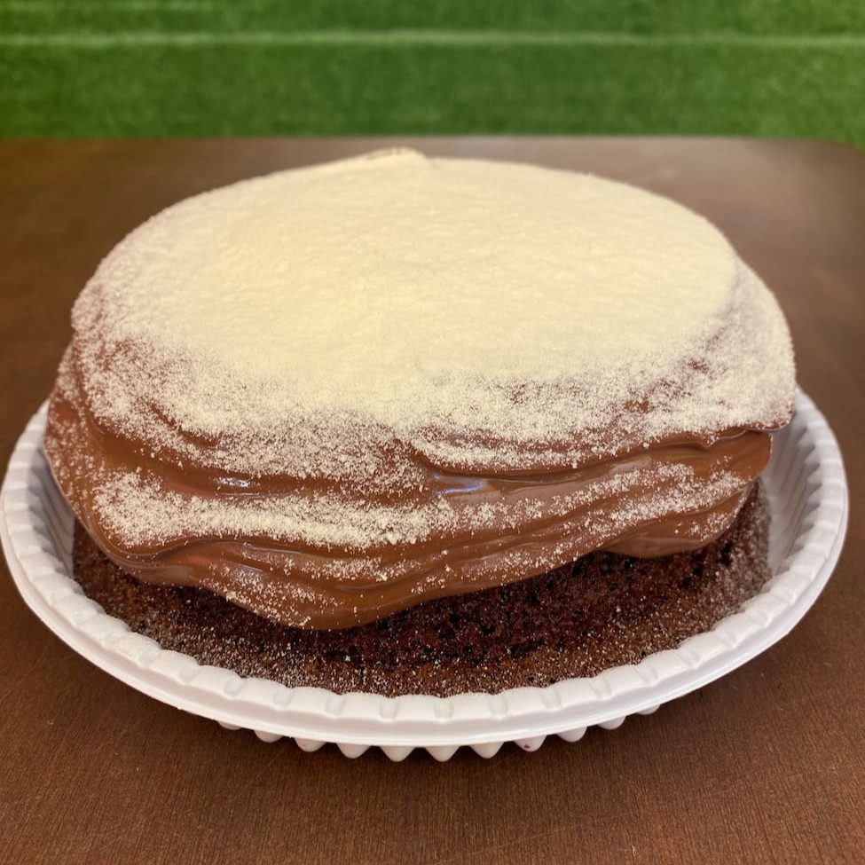Massa caseira de chocolate nobre , coberto com creme de Ninho cremoso e leite Ninho em pó