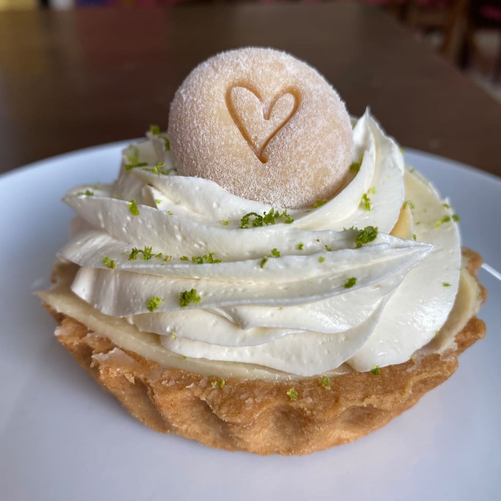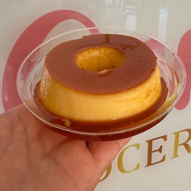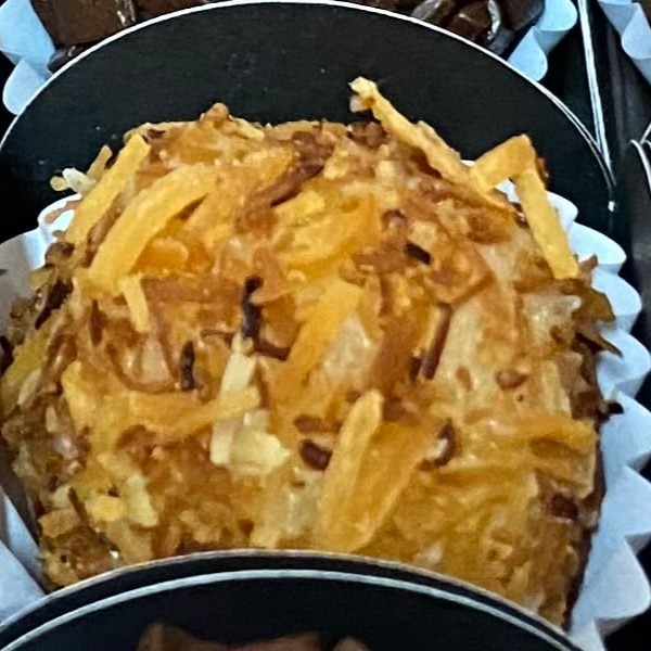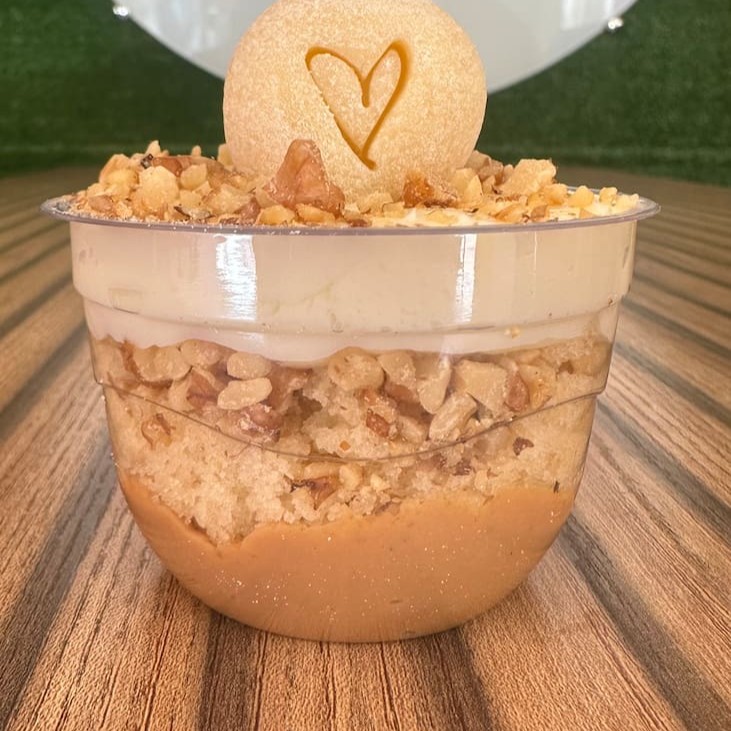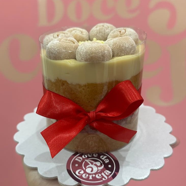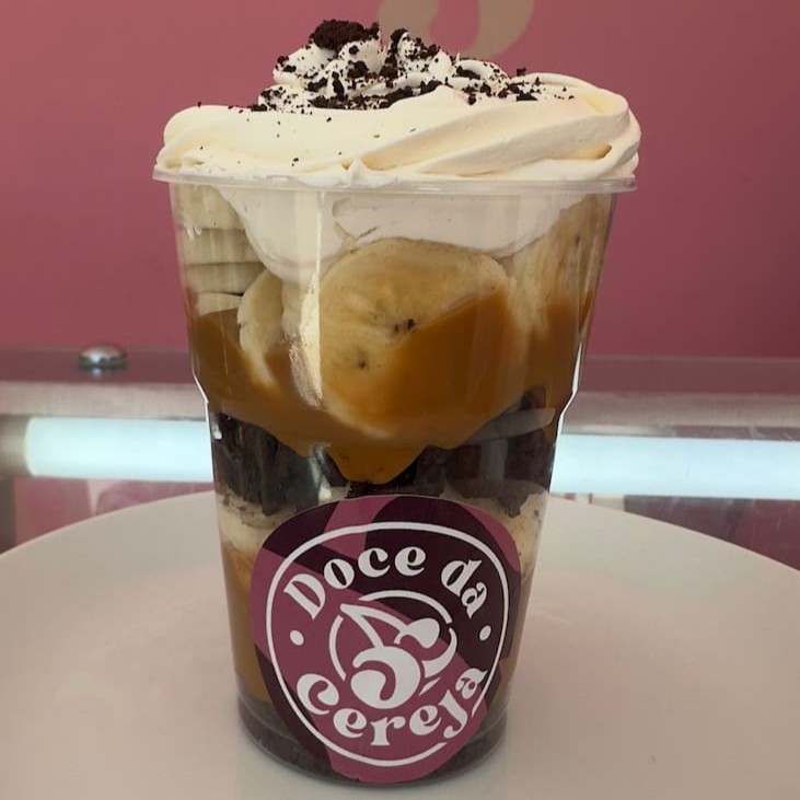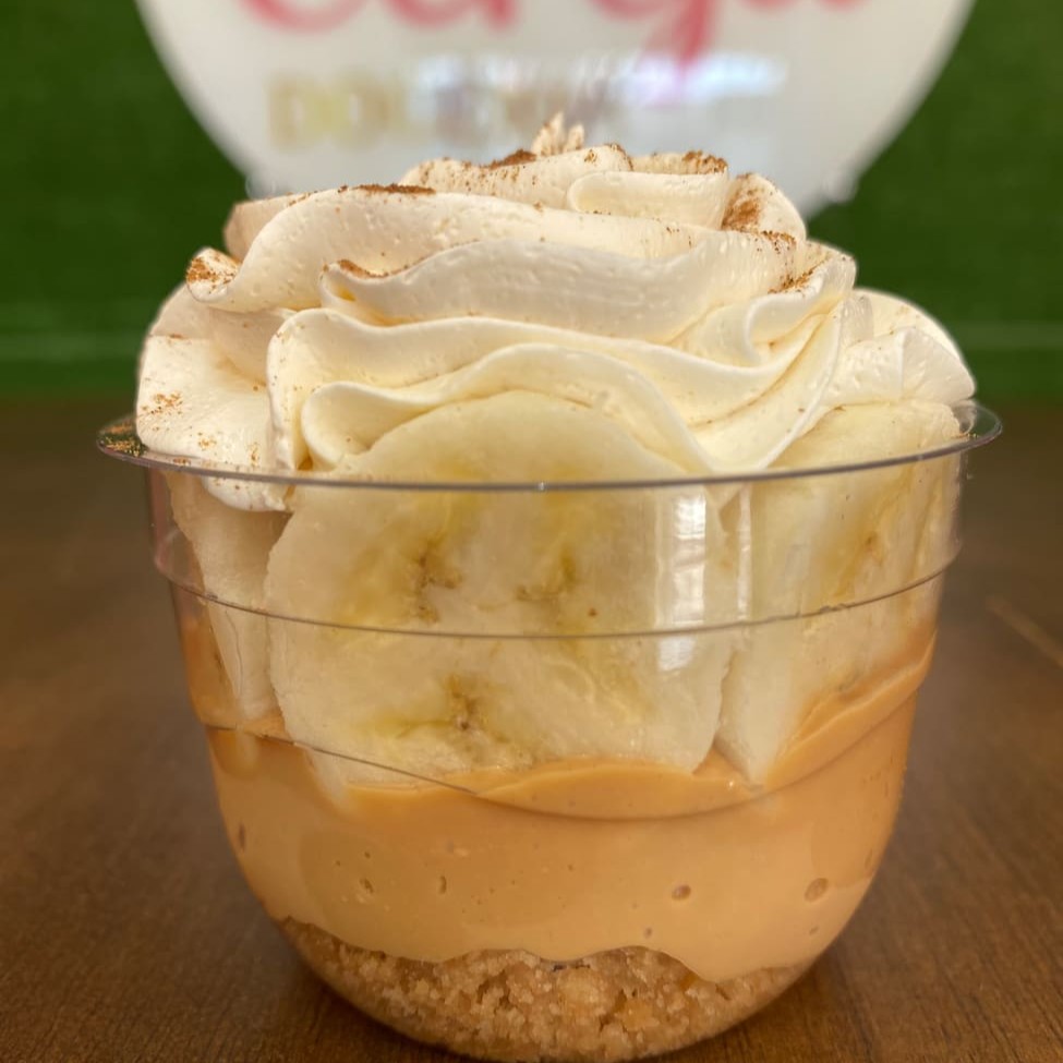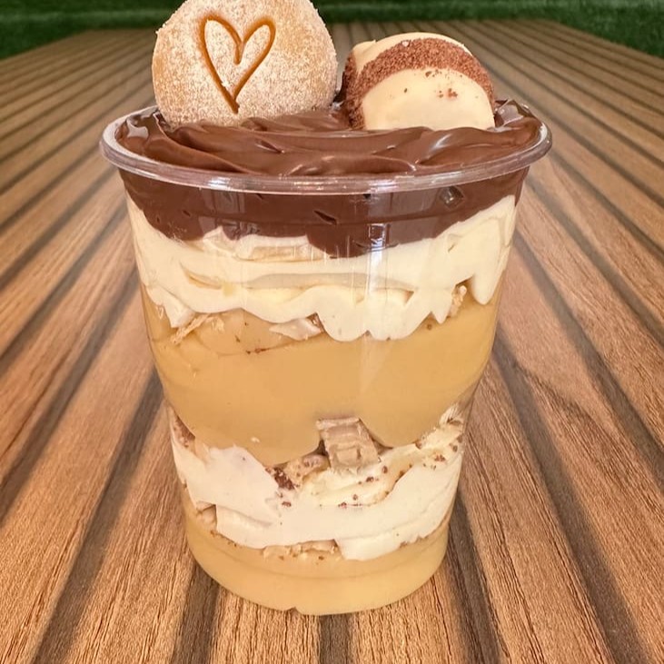 Massa Baunilha caseira, doce de leite cozido, coco e calda especial.