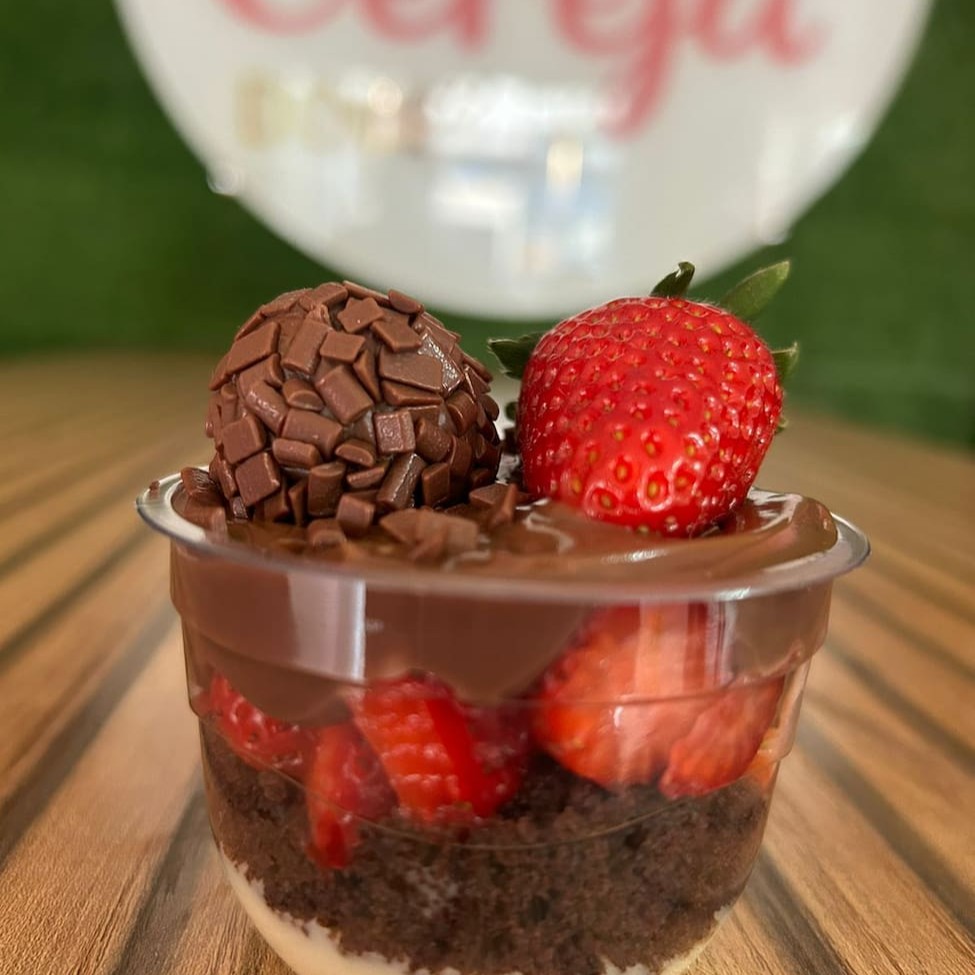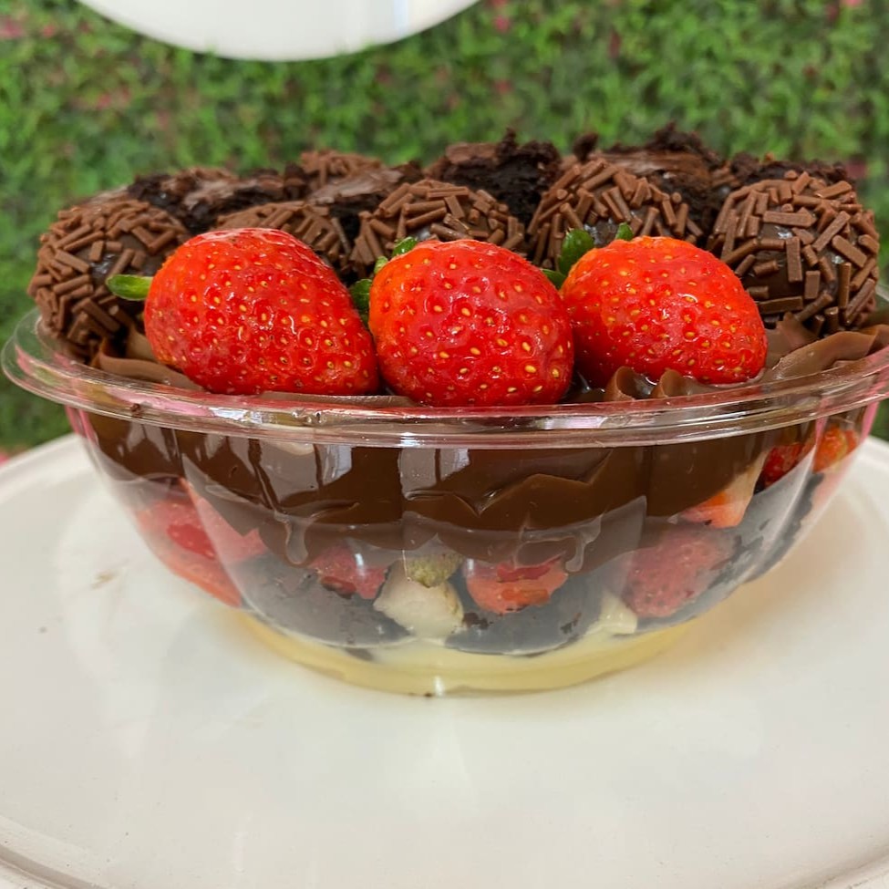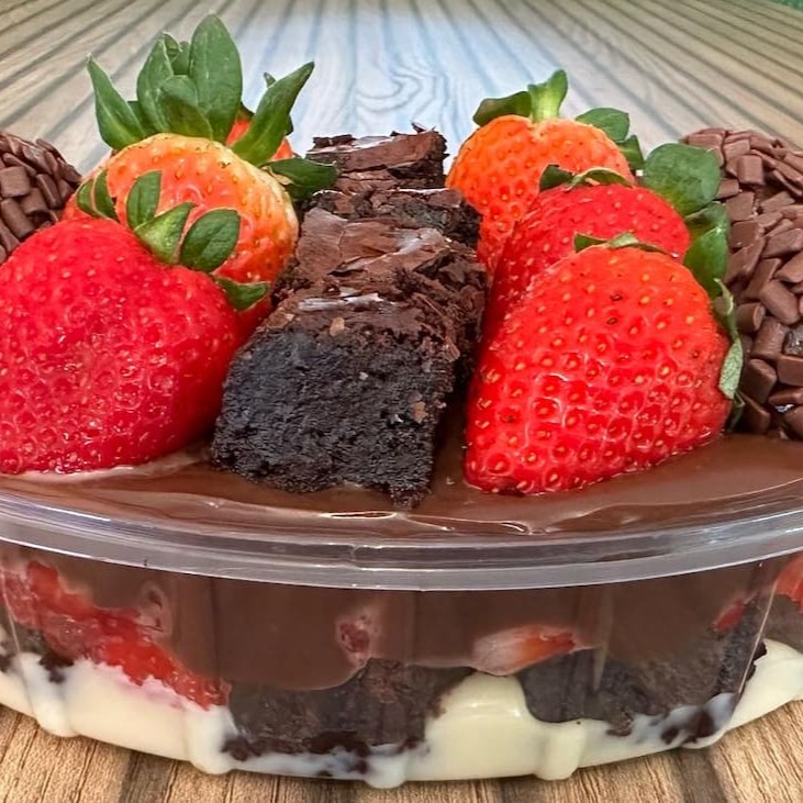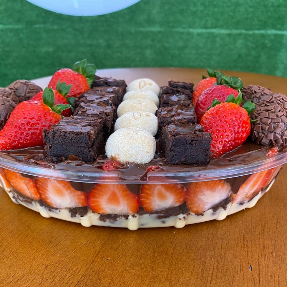 Brownie , morangos frescos , brigadeiro cremoso de leite Ninho , brigadeiro cremoso de chocolate ao leite