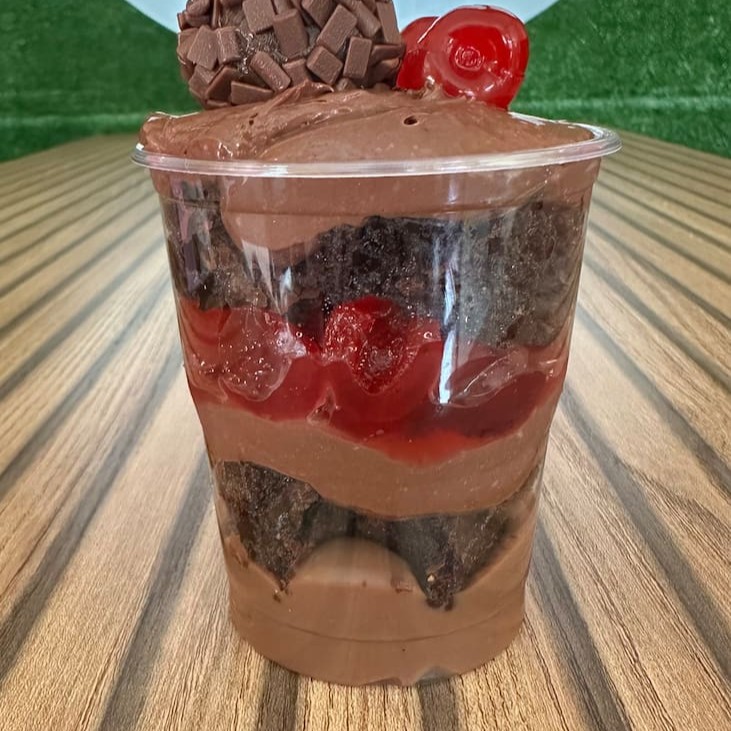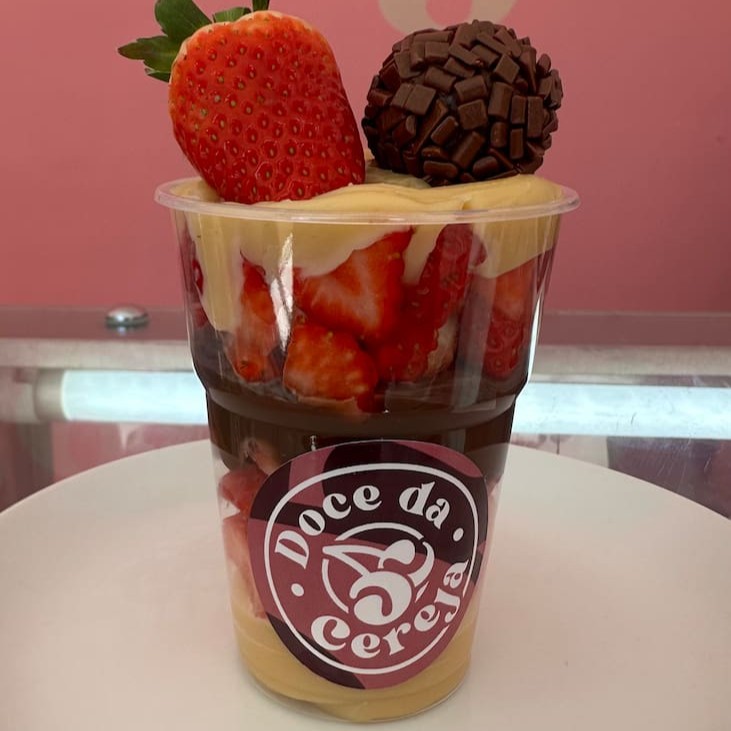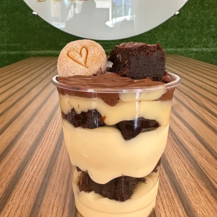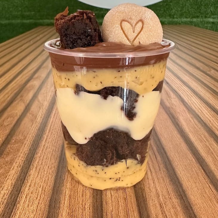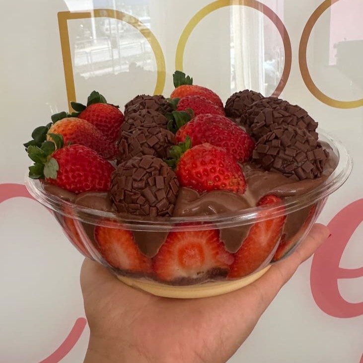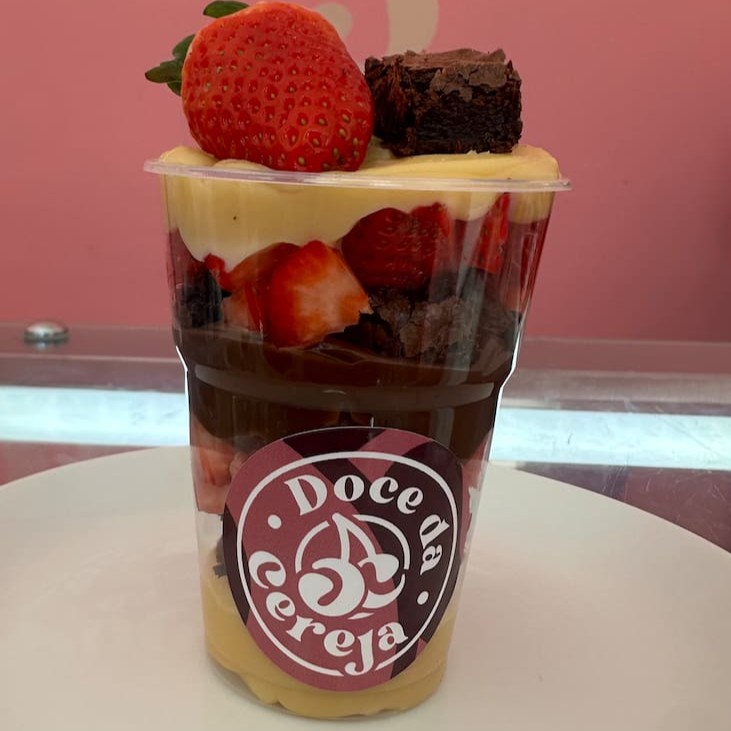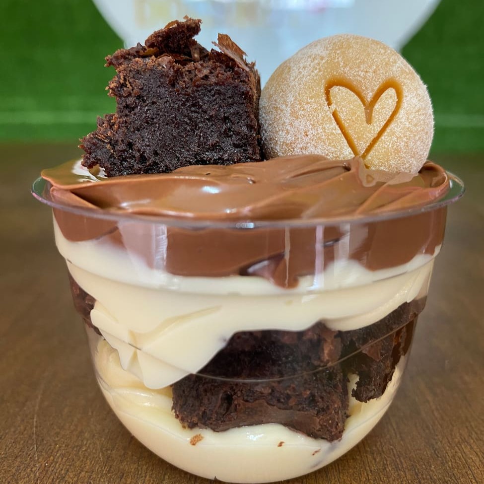Brownie , morangos frescos , brigadeiro cremoso de leite Ninho , brigadeiro cremoso de chocolate ao leite