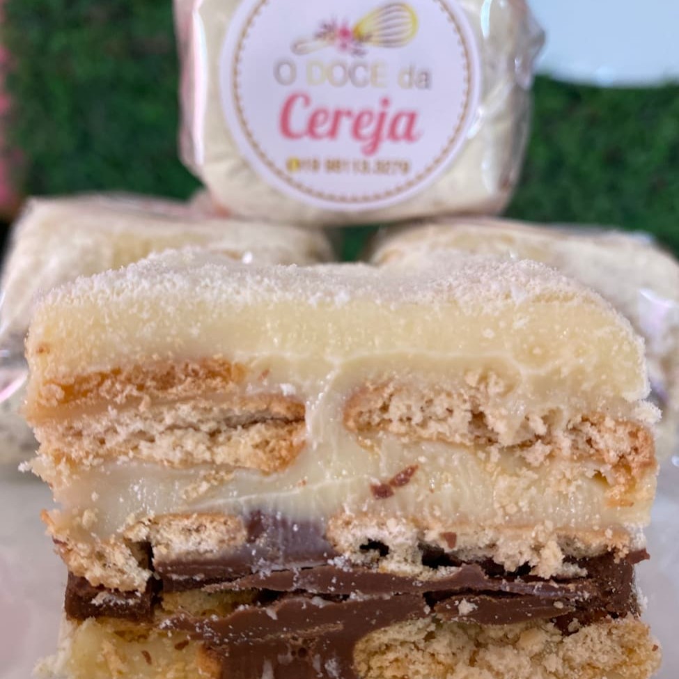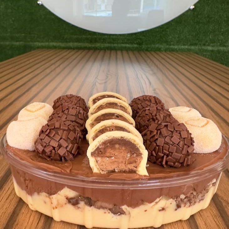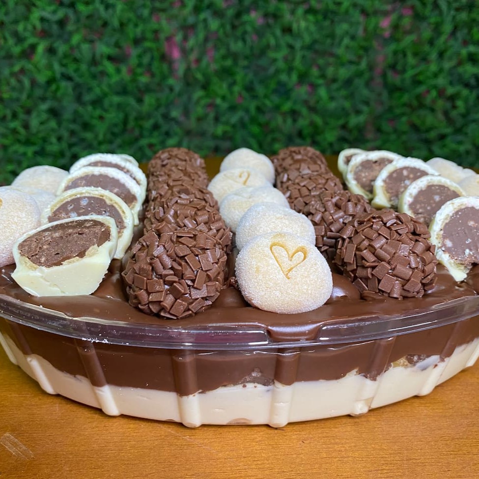Travessa com recheio de creme de Ninho, bombom Ouro Branco picado e trufa chocolate blend