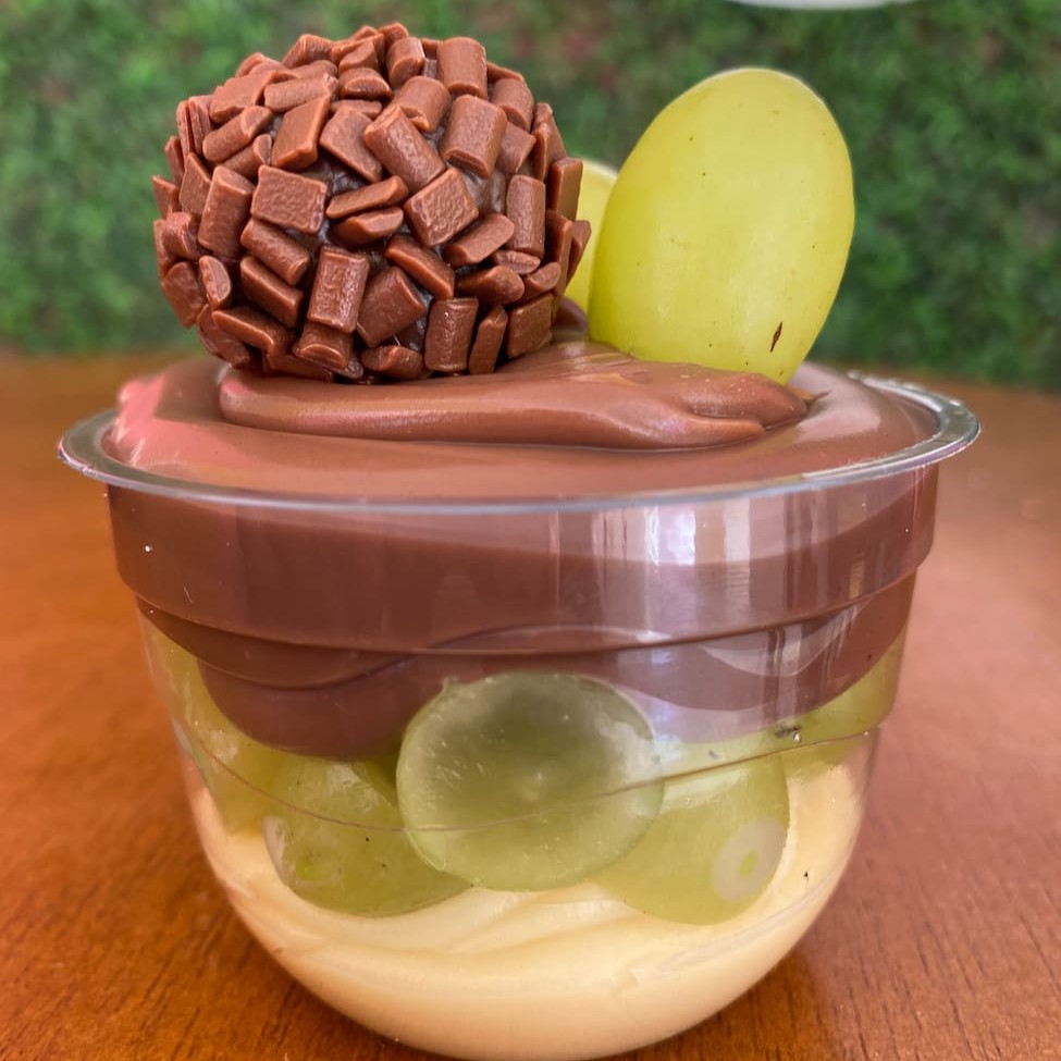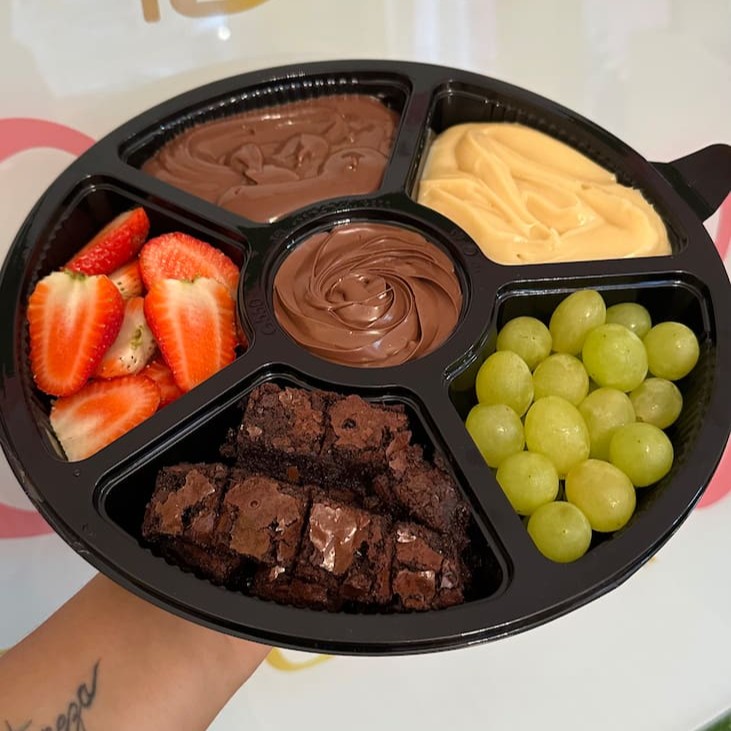 Brownie picados , morangos , uvas verdes , brigadeiro gourmet de chocolate cremoso , brigadeiros gourmet cremoso de Ninho e Nutella