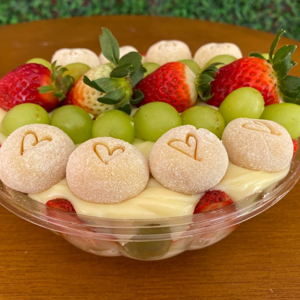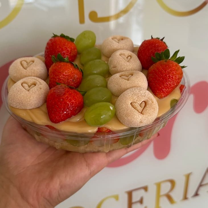 Massa de beunilha , creme de Ninho , brigadeiro de Ninho cremoso , abacaxi cozido caseiro , morangos e uvas verdes