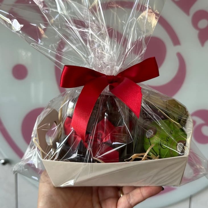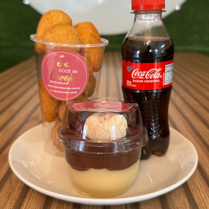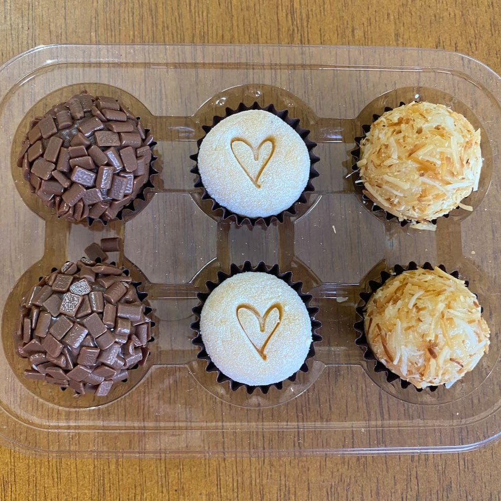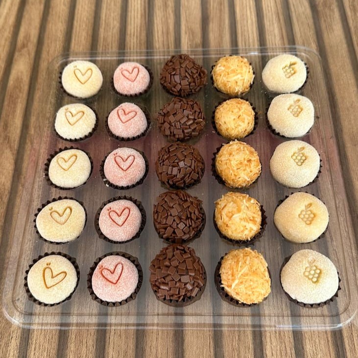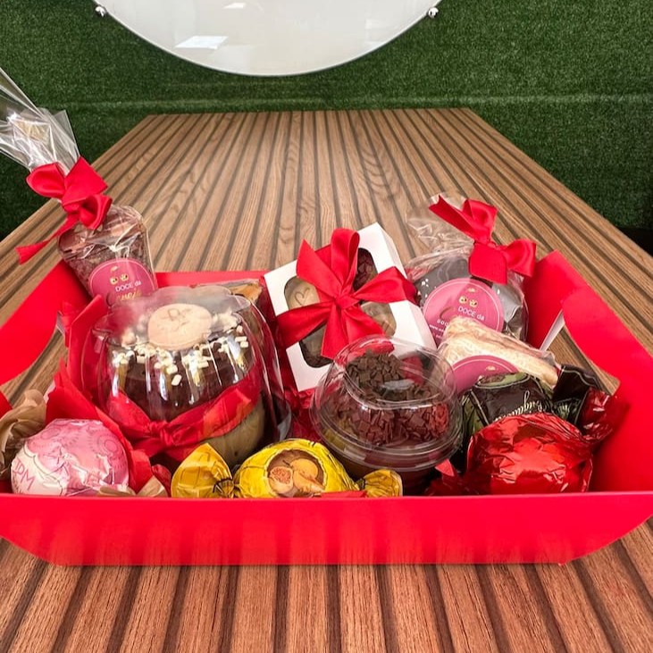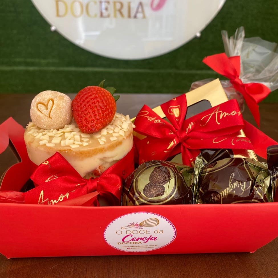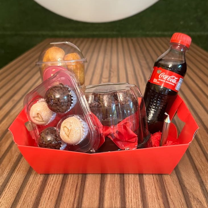 1 mini bolo, 1 pao de Mel , 1 bolo gelado, 1 potinho da felicidade , 2 palha italiana , 4 trufas, 1 caixinha com 6 brigadeiros e 1 brownie recheado