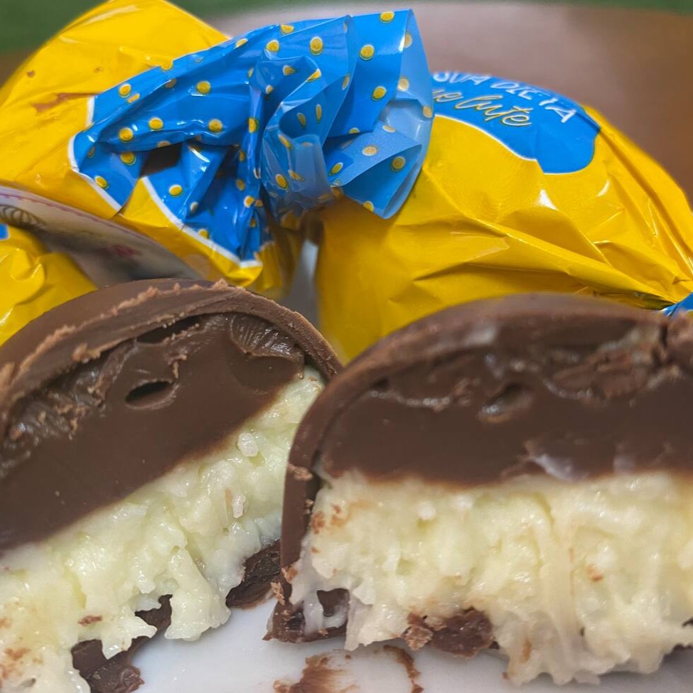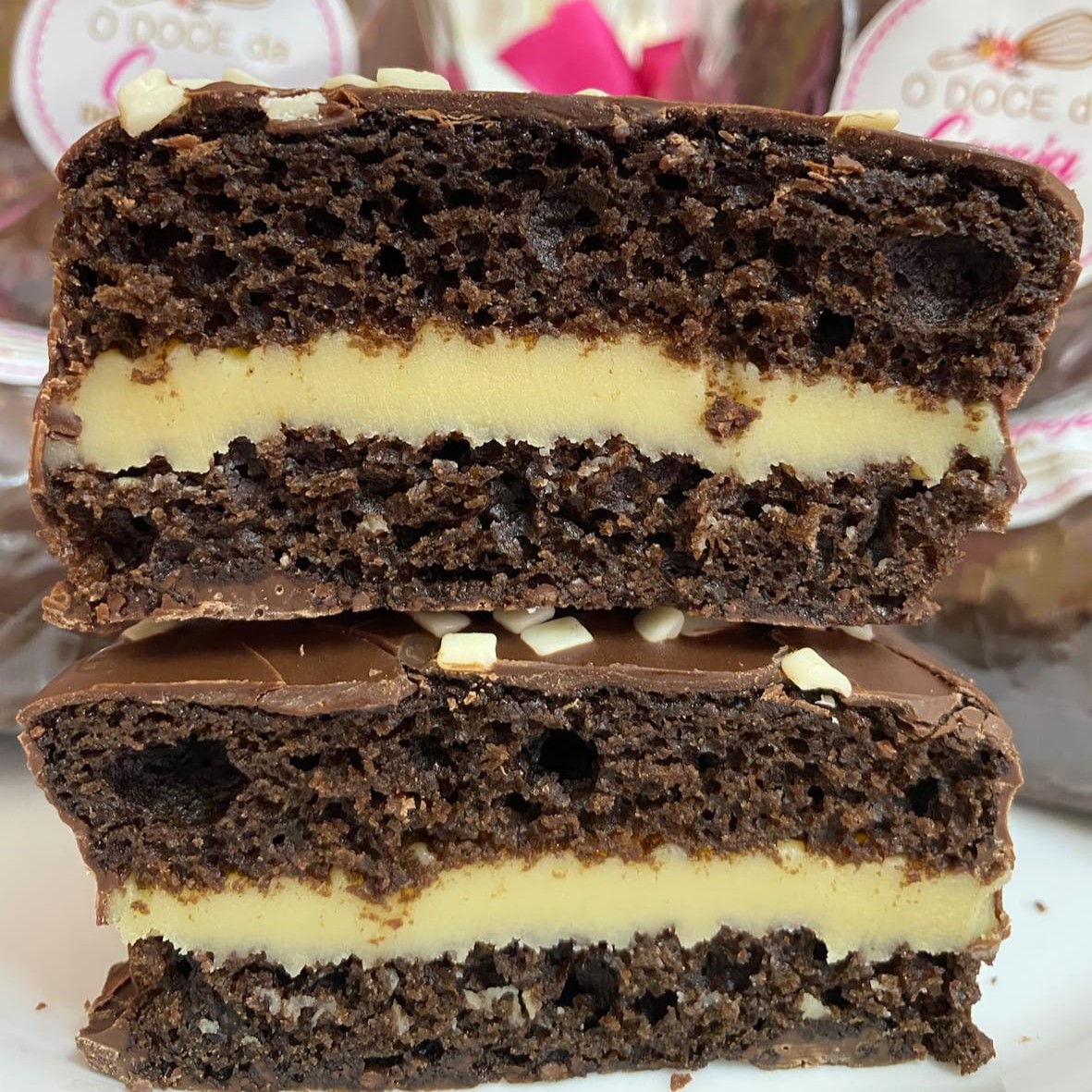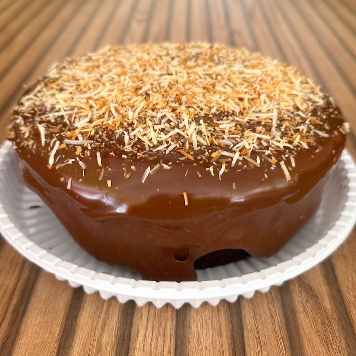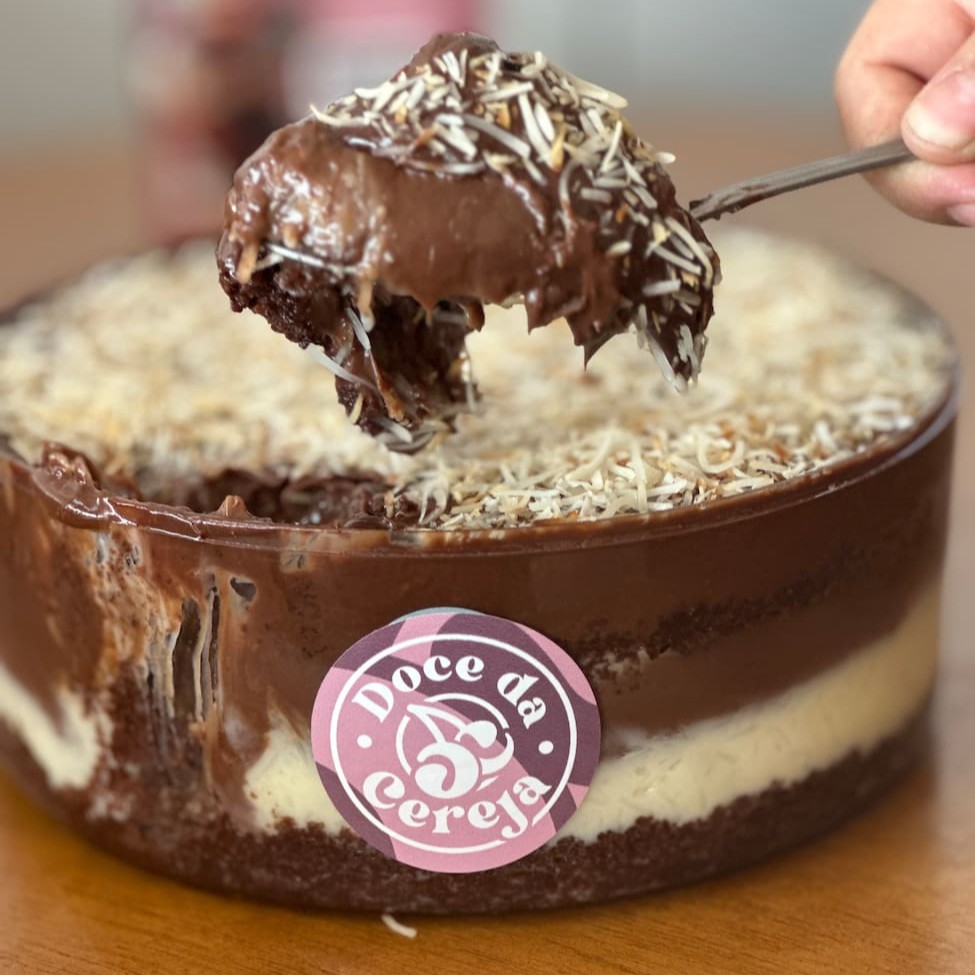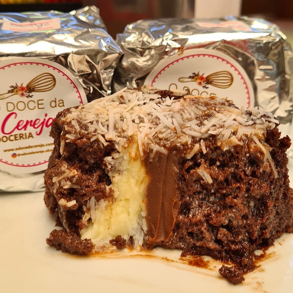 Massa caseira de chocolate nobre com recheio de cocada cremosa, brigadeiro ao leite cremoso e coco queimado por cima