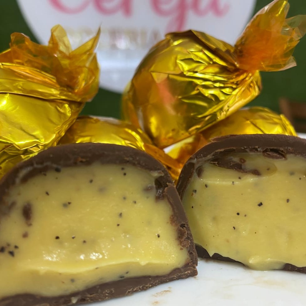 Recheio de Creme de Ninho, trufa blend de chocolate nobre e bombons Ouro Branco picados