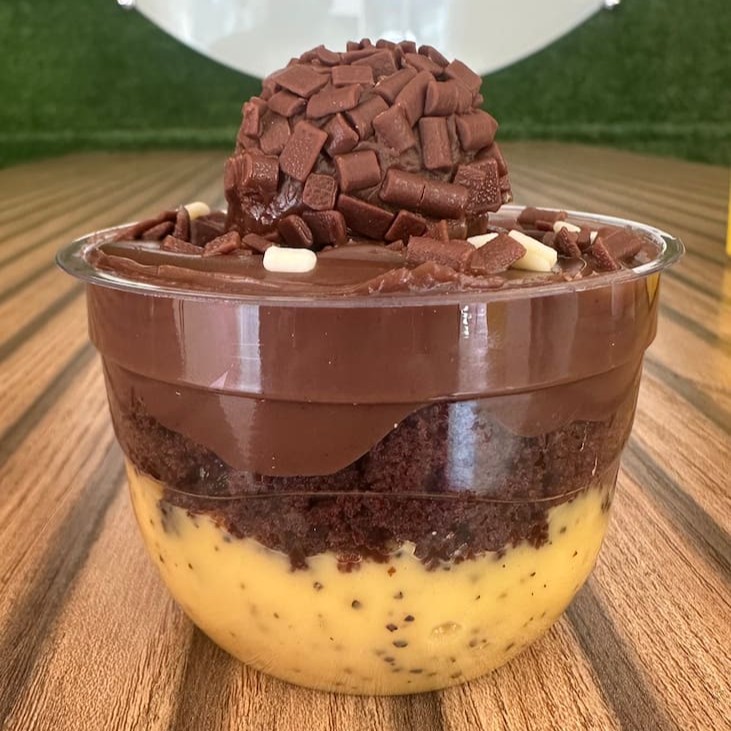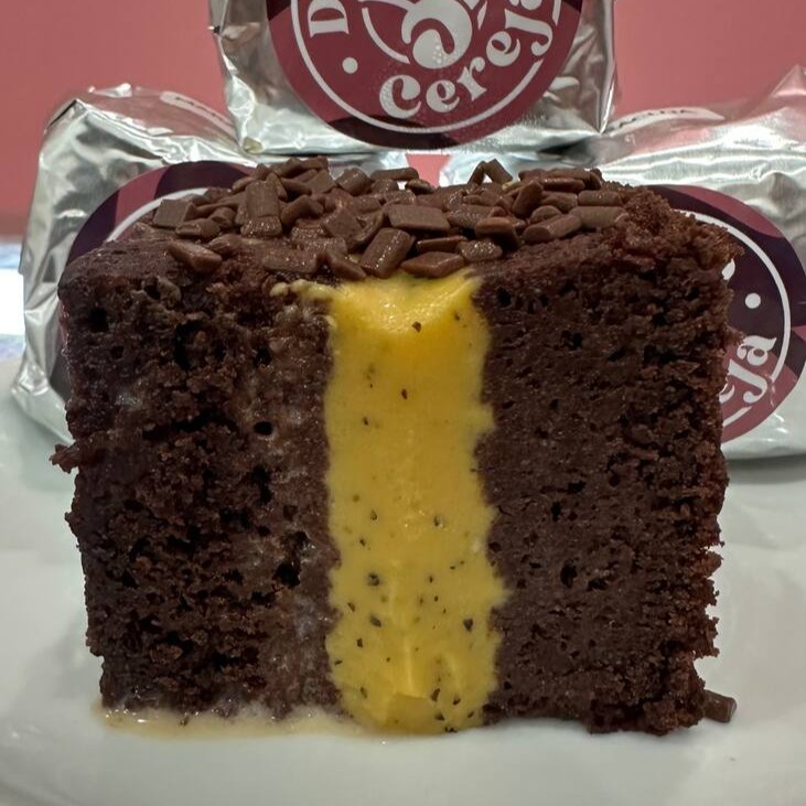 Massa caseira de chocolate nobre bem molhadinho com nossa calda especial, recheio de brigadeiro de maracujá e grabule ao leite nobre