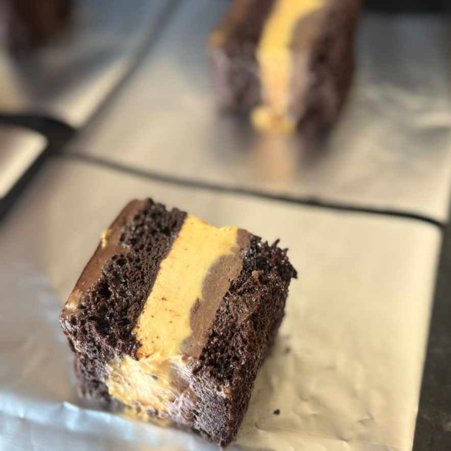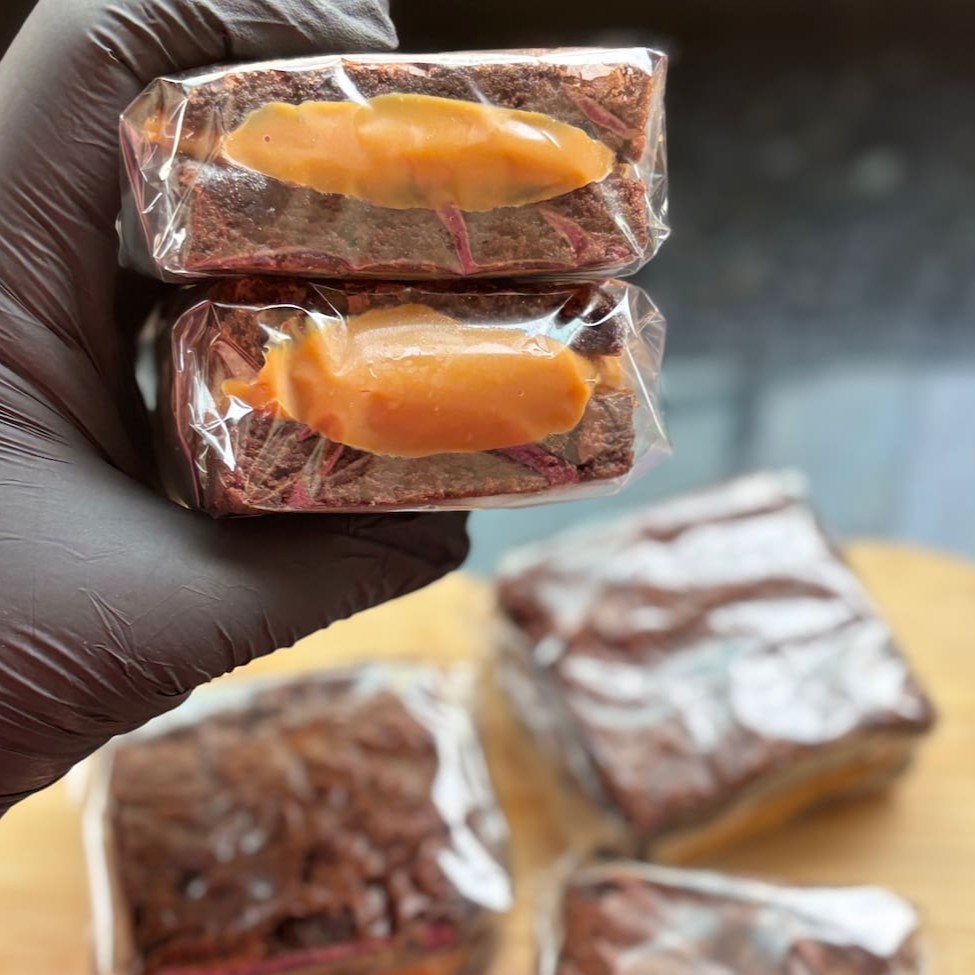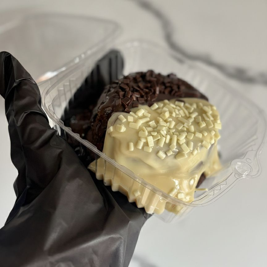 Brownie de chocolate macio e intenso, recheado com brigadeiro cremoso de maracujá, equilibrando perfeitamente o doce do chocolate com o azedinho da fruta. Aprox. 120 a 130g.