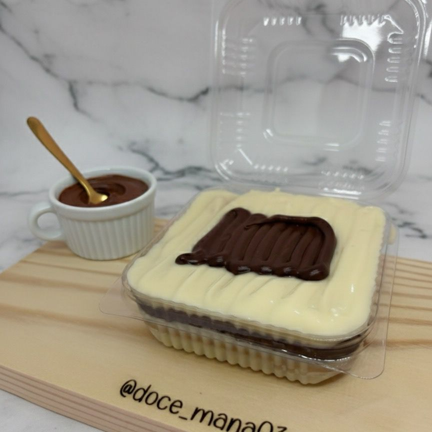 Bolo branco macio e delicado, coberto com brigadeiro de Ninho super cremoso e com Nutella colocada no centro do bolo, formando um recheio surpreendente que escorre a cada colherada. aprox. 250g a 260g.