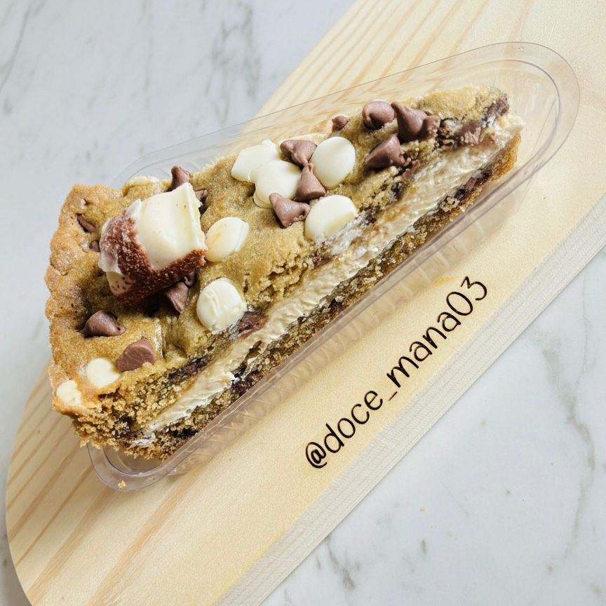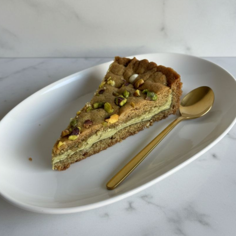 Fatia de torta cookie com massa macia e amanteigada, preparada com gotas de chocolate branco, recheada com creme de pistache e finalizada com pistache por cima. Uma combinação cremosa, equilibrada e irresistível para os amantes de pistache.