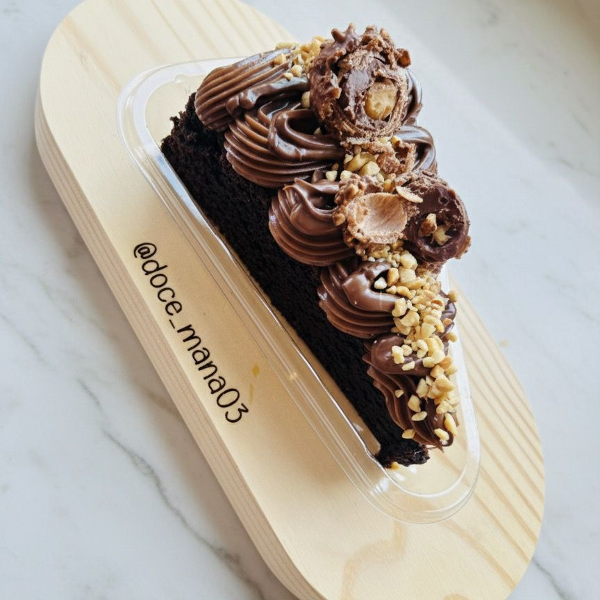 Fatia de generosa de Brownie denso e chocolatudo, finalizado com uma cobertura cremosa de chocolate, Nutella, amendoim triturado e um Ferrero Rocher inteirinho para aquele toque crocante, sofisticado e irresistível.