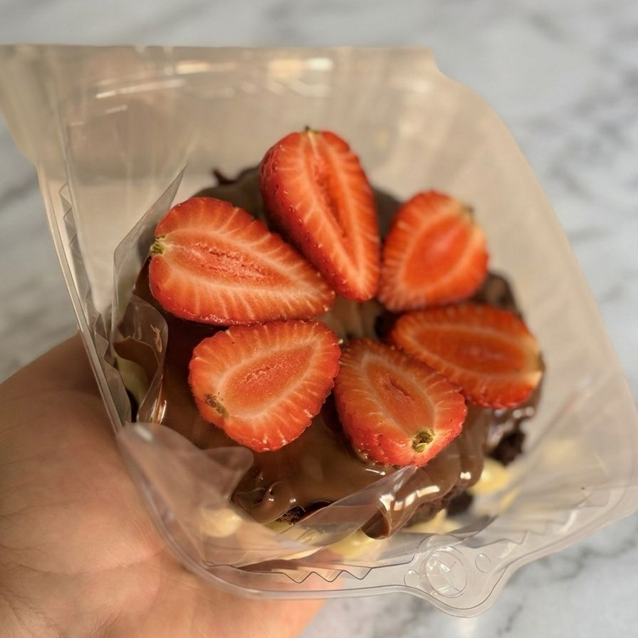 Brownie artesanal com duas camadas de brownie super macio, recheado com brigadeiro de Ninho cremoso, finalizado com Nutella e morangos frescos. Uma sobremesa intensa, bem recheada e irresistível para quem ama chocolate. Aprox. 300g